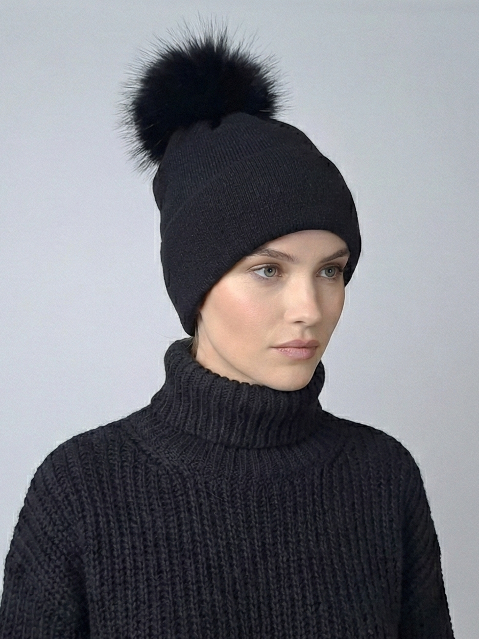 Lækker uld strikhue med ræve pels pompon. Desuden kan man også lave den om til et uld halstørklæde der lukkes i elastikstrop med pels kvasten, Således har den to funktionsmuligheder.