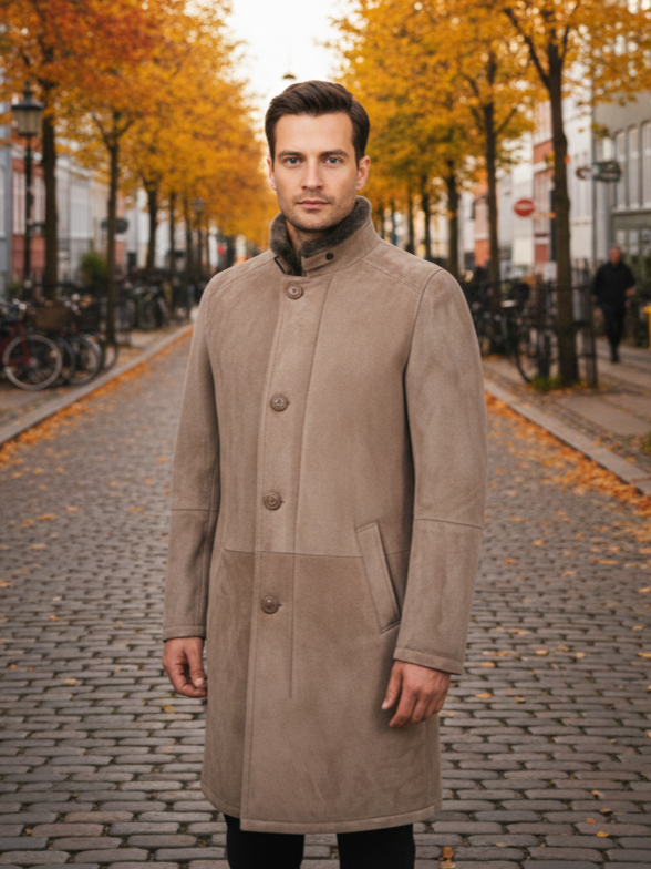 Herrefrakke i rulamspels. Prøv denne klassiske rulamsjakke til mænd. Din krop vil ånde fritt gennem pelsen og foret. Den flotte krave er smuk, når den er åben, men kan også lukkes for din komfort, når det bliver koldt.