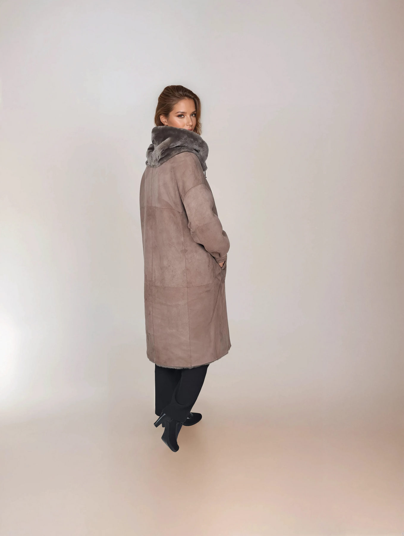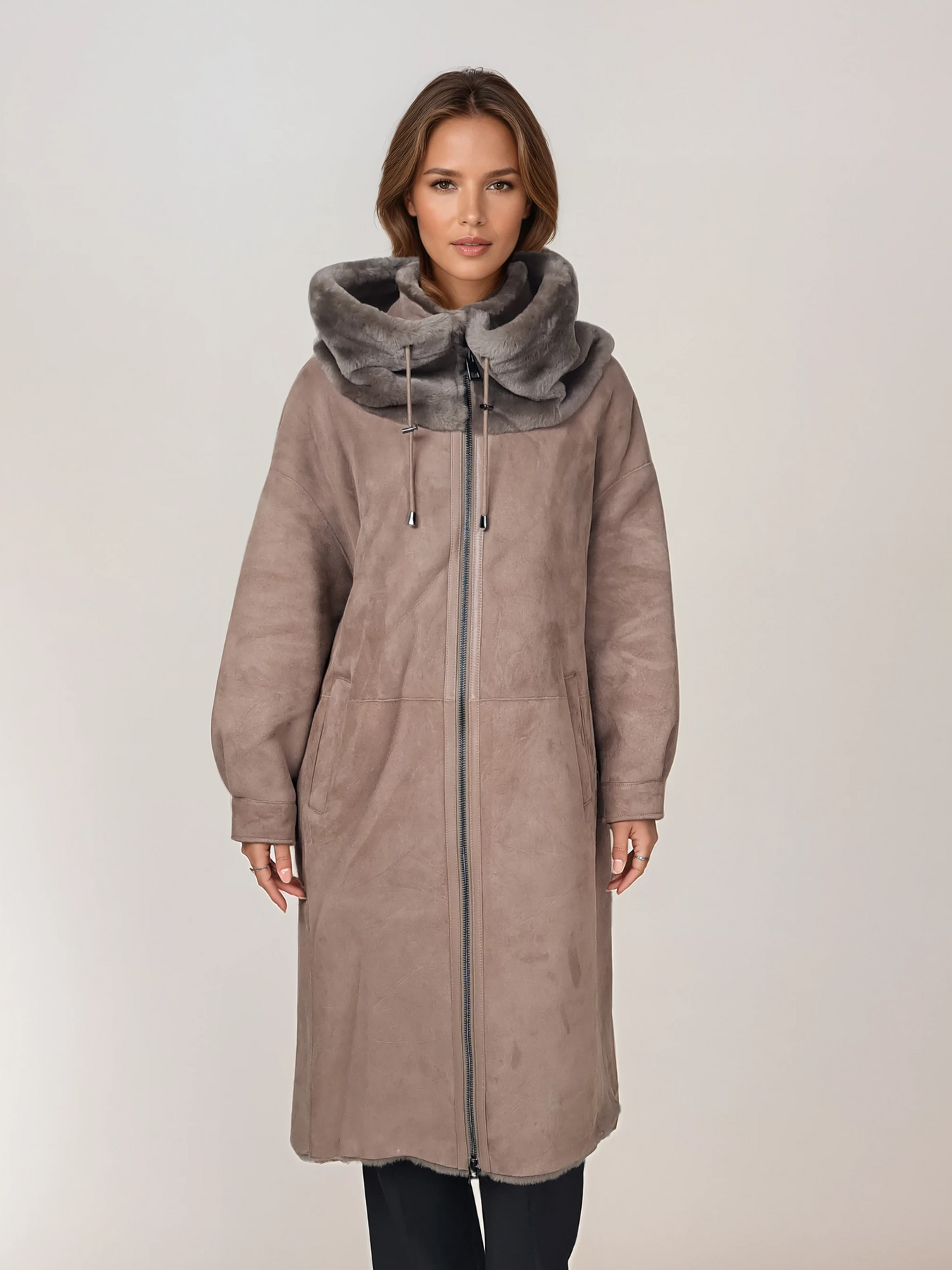 Die New Gabiana verkörpert zeitgenössischen Luxus mit ihrer Kapuze, die von einem faszinierenden Pelzkragen geschmückt ist, der für strukturelle Tiefe und visuellen Reiz sorgt. Die Außenseite ist aus geschmeidigem Lammwildleder in warmer dunkler Eiche gefertigt und entwickelt mit der Zeit ihren Charakter, während das umhüllende Fellfutter für unvergleichliche Weichheit und Isolierung sorgt. Diese Jacke zelebriert die Verbindung von unverwechselbarem Design und sinnlichem Komfort – jedes Element lädt zum Berühren und Bewundern ein. Für die Frau, die sowohl Präsenz als auch Raffinesse schätzt, ist die New Gabiana mehr als nur Oberbekleidung; Es verwandelt sich in ein charakteristisches Stück, das anspruchsvollen Geschmack und Wertschätzung für außergewöhnliche Handwerkskunst widerspiegelt.