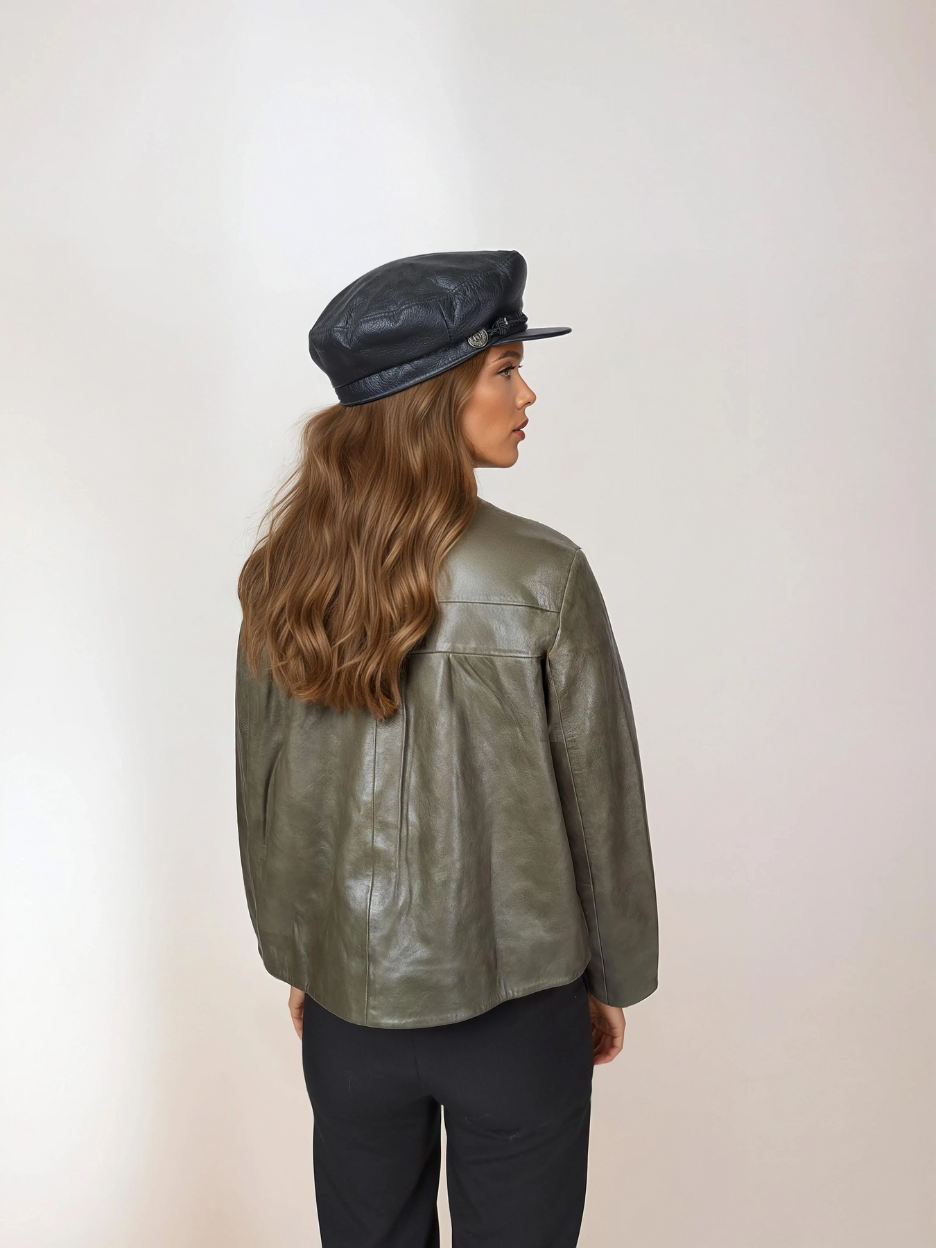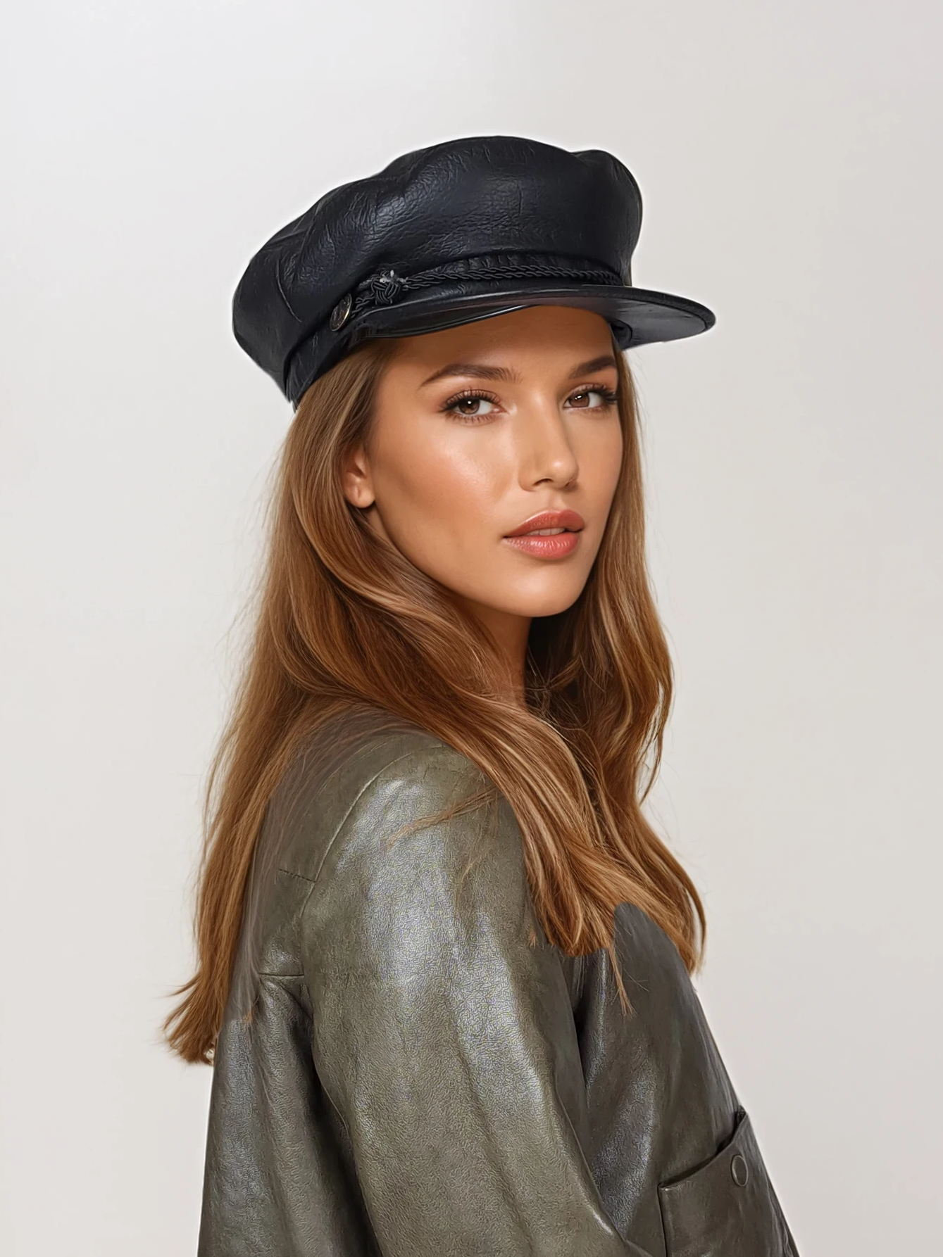 This leather hat embodies timeless sophistication and versatile style. Crafted from quality leather in classic black, it offers a refined elegance for any occasion. The structured design provides a polished silhouette while the durable material ages beautifully with wear. An essential accessory that completes your wardrobe with understated luxury and enduring appeal.