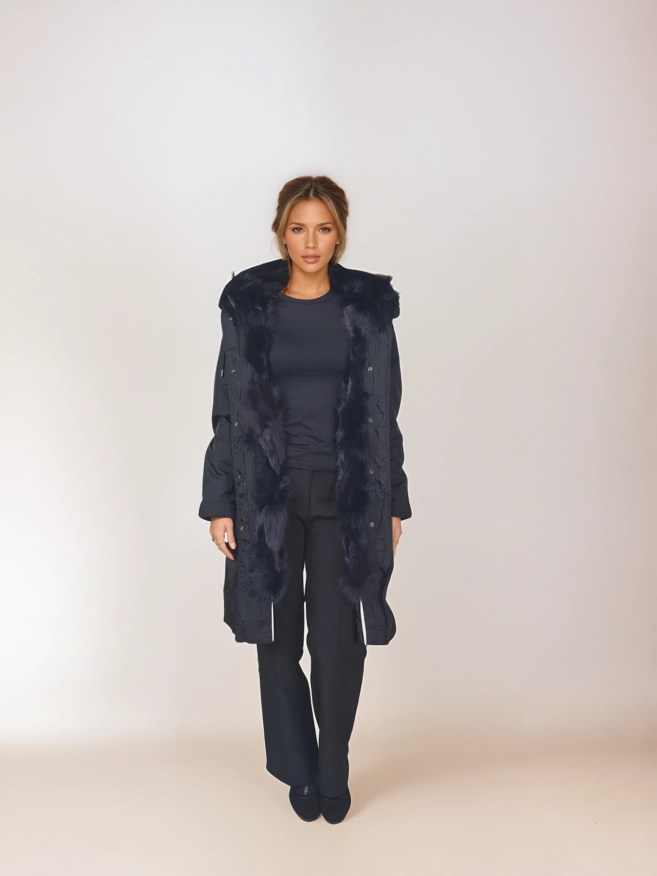 Der Calgary-Mantel vereint praktische Vielseitigkeit mit raffinierter Eleganz. Dieses 95 cm große Textilstück verfügt über eine funktionelle Kapuze und ein luxuriöses, herausnehmbares Fuchsfutter, das sich Ihrem Lebensstil anpasst. In klassischem Schwarz ist es ein unverzichtbares Kleidungsstück, das mühelos zwischen den Jahreszeiten wechselt – tragen Sie es vollständig gefüttert für maximale Wärme oder entfernen Sie das Fuchsfutter für eine leichtere Schichtung. Dieser Mantel wurde für Frauen entwickelt, die sowohl Wert auf Eleganz als auch auf Anpassungsfähigkeit legen. Er bietet dauerhaften Stil und außergewöhnliche Funktionalität.