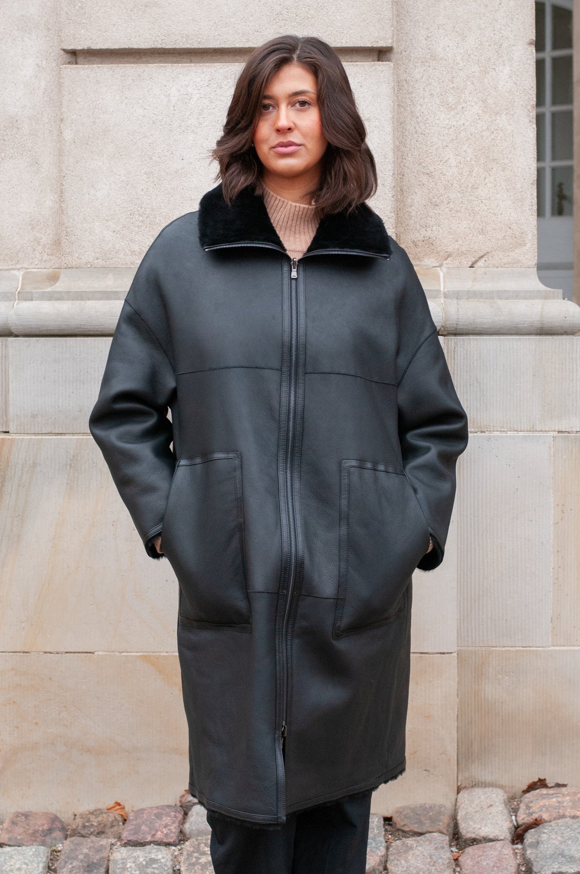 Embrace versatile luxury with this exquisite reversible shearling coat. Crafted from premium double-faced lambskin, this coat offers two distinct looks in one. One side features a sleek, sophisticated nappa leather finish in classic black, while the reverse reveals a plush, curly lamb fur texture for unparalleled warmth and a cozy aesthetic. Designed with a high collar and a relaxed silhouette, it's the perfect statement piece for effortless winter elegance, allowing you to adapt your style to any occasion.