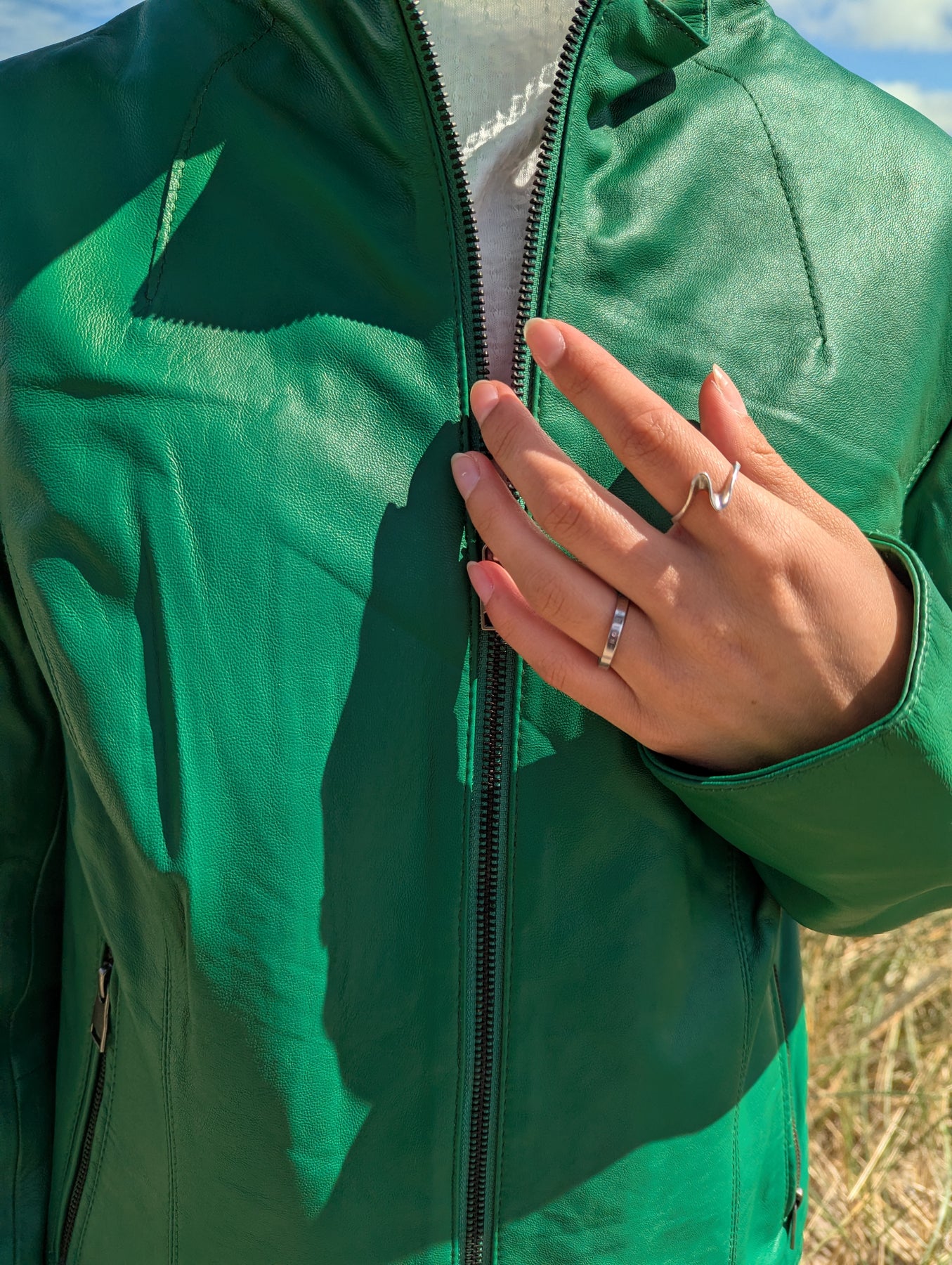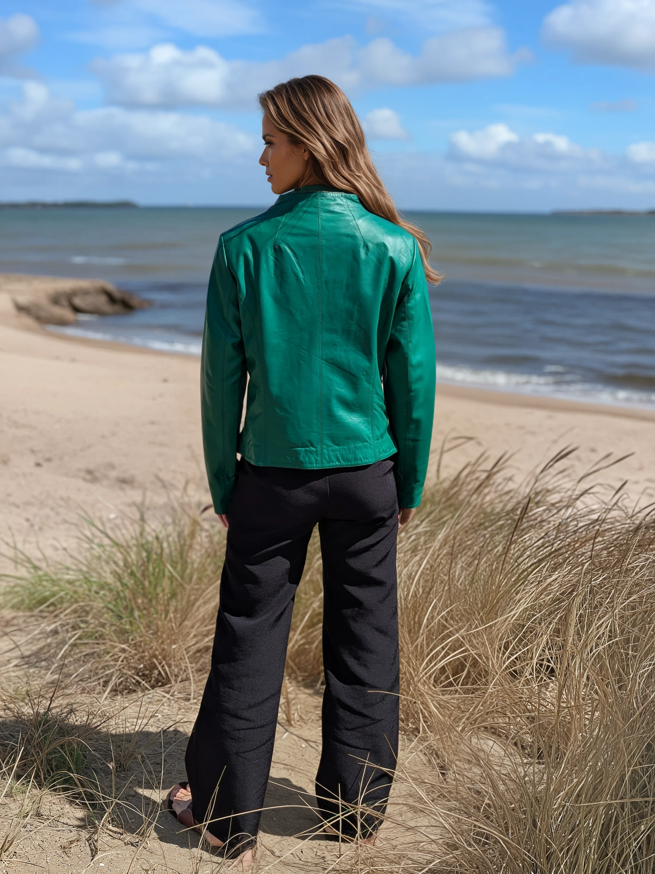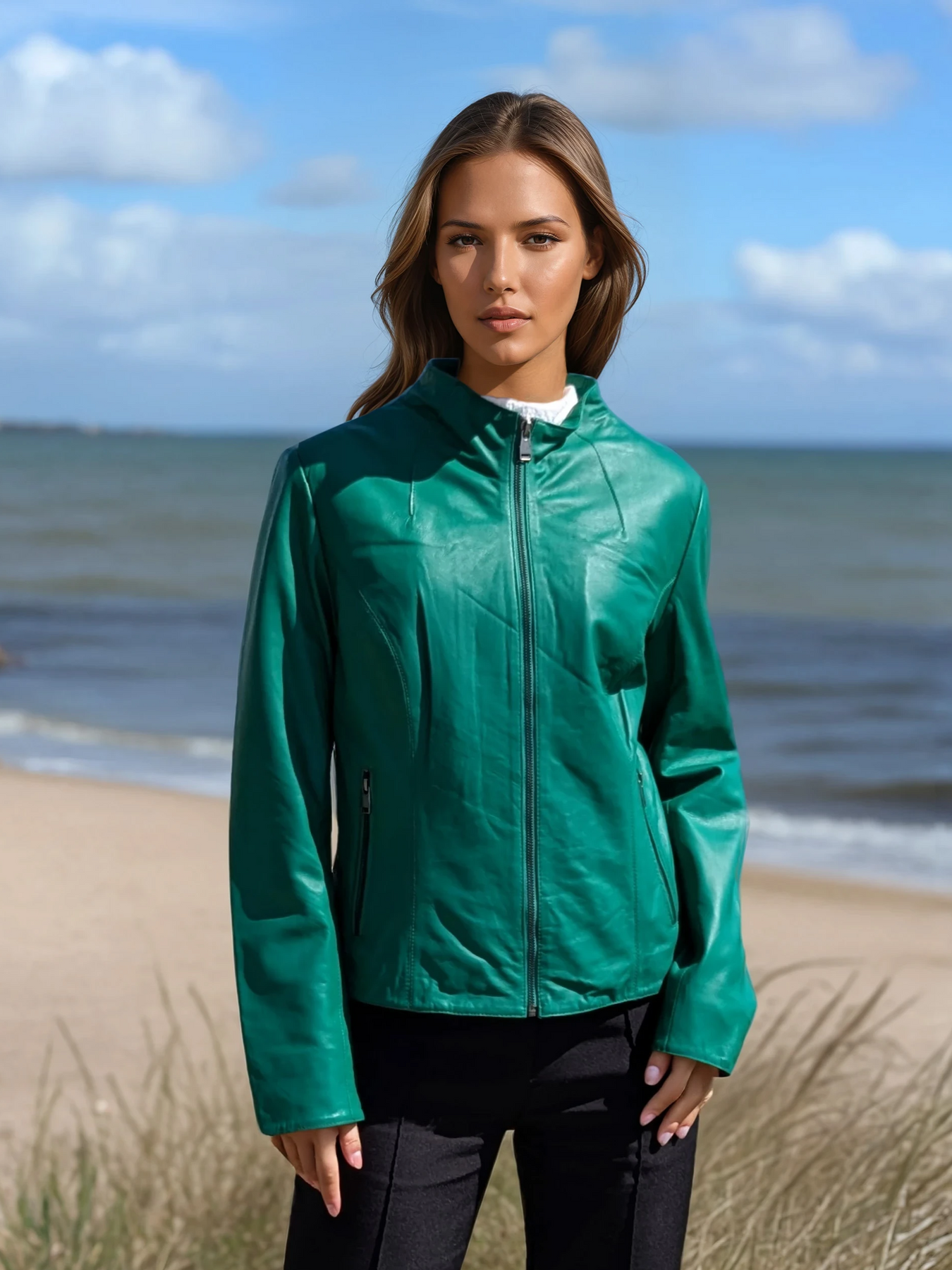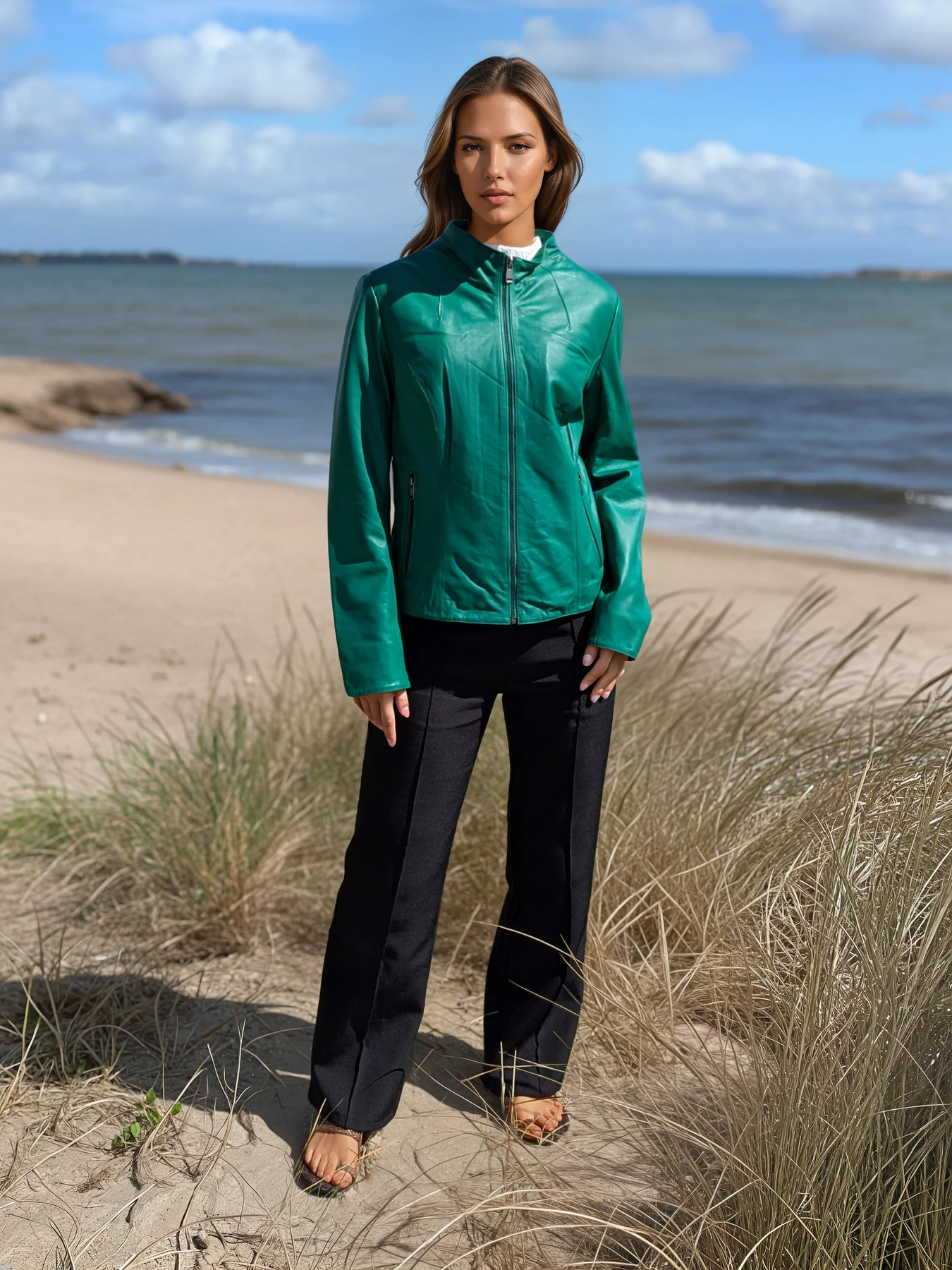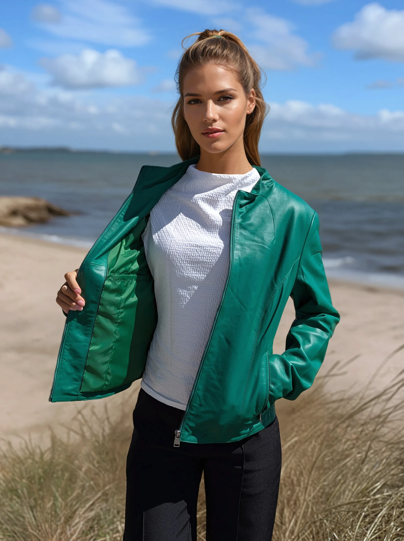 Denne stilfulde lammelæderjakke til kvinder fra Levinsky har et glat polyesterfor for ekstra komfort og holdbarhed. Designet med praktiske indvendige lommer giver den praktisk opbevaring uden at gå på kompromis med dens slanke silhuet. Den friske nye grønne farve og 55 cm længde gør den til en alsidig og moderne tilføjelse til din garderobe, perfekt til at løfte ethvert outfit med et strejf af raffineret elegance.