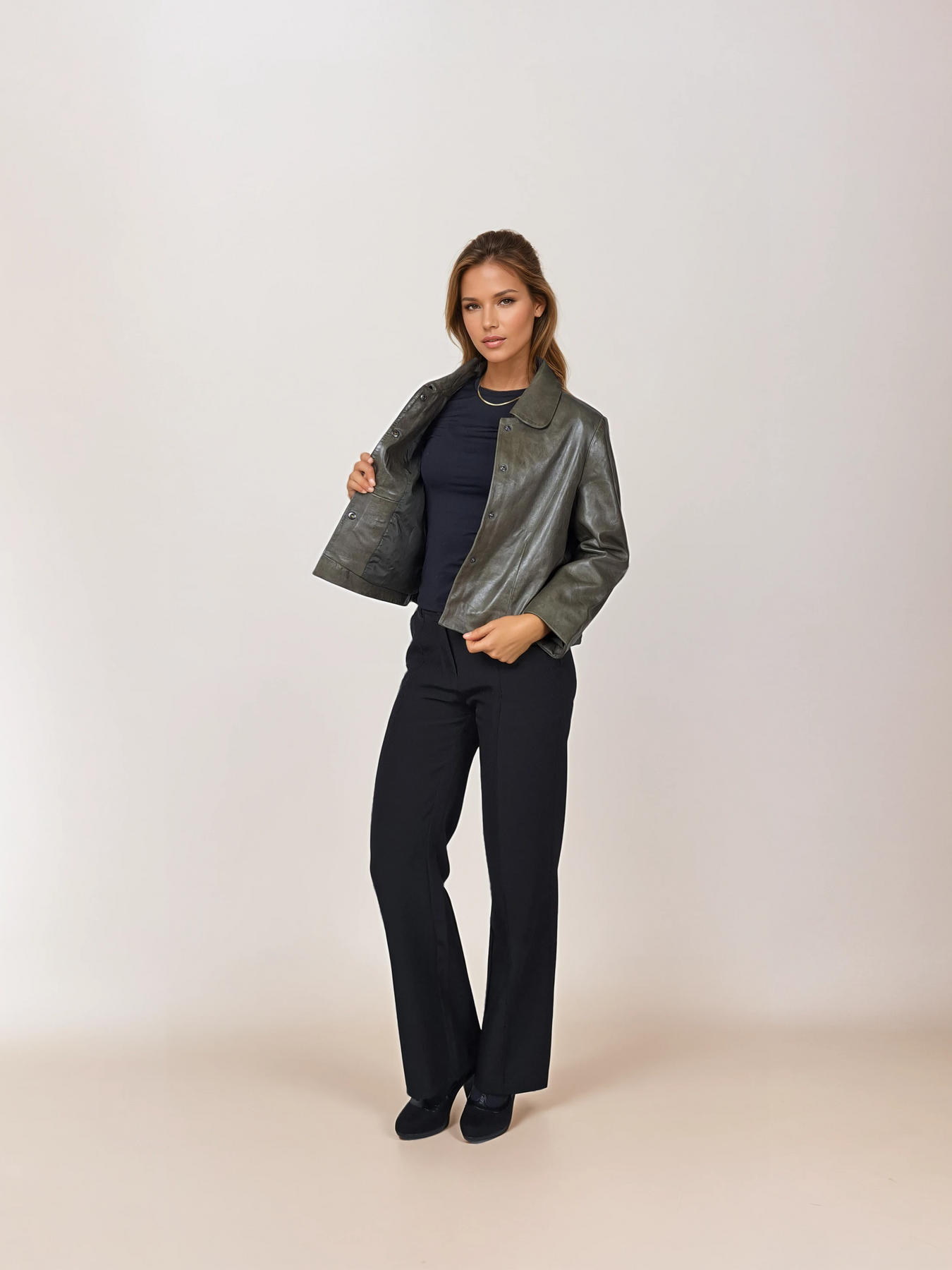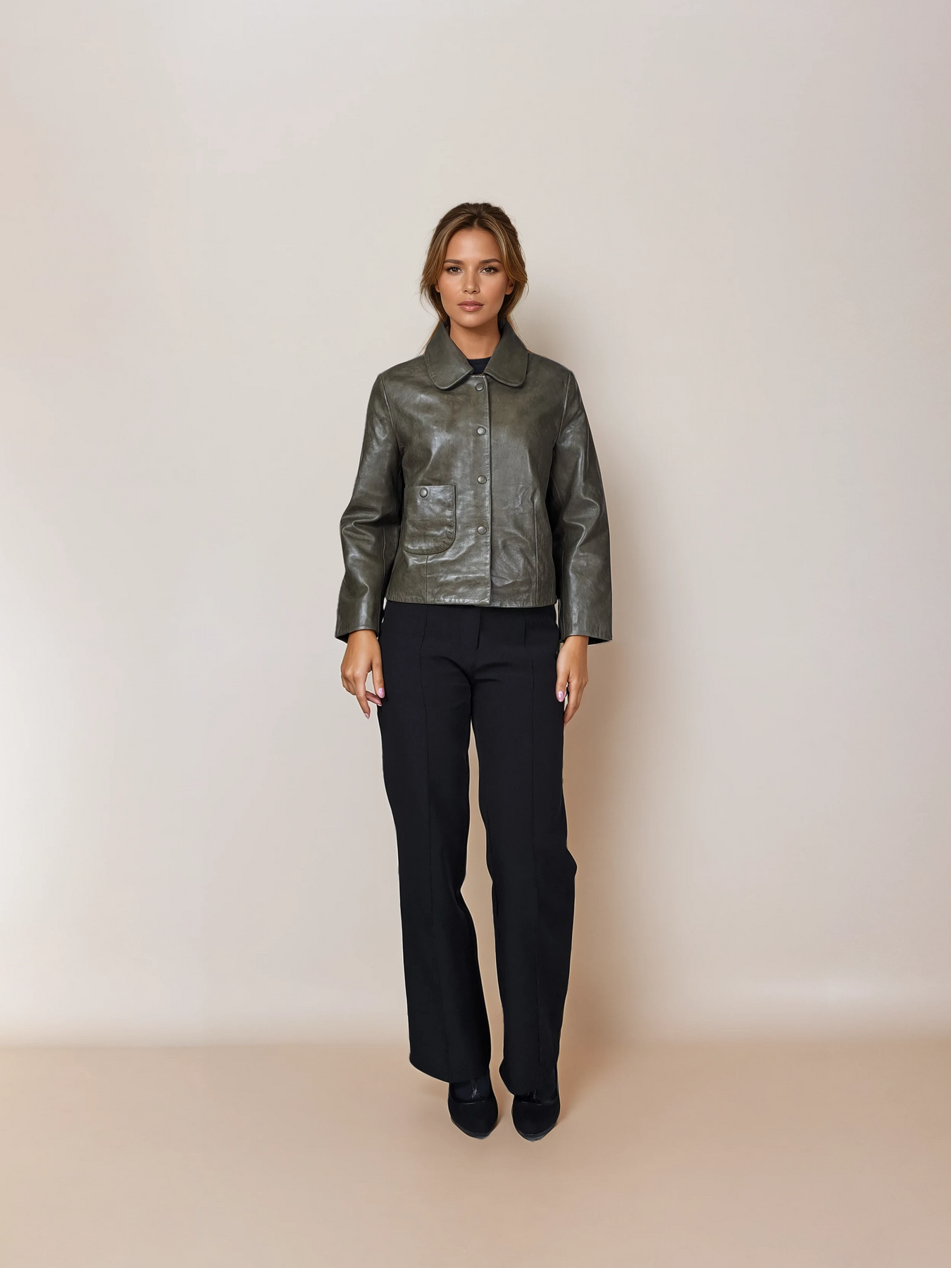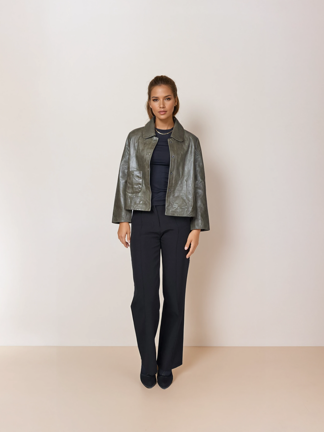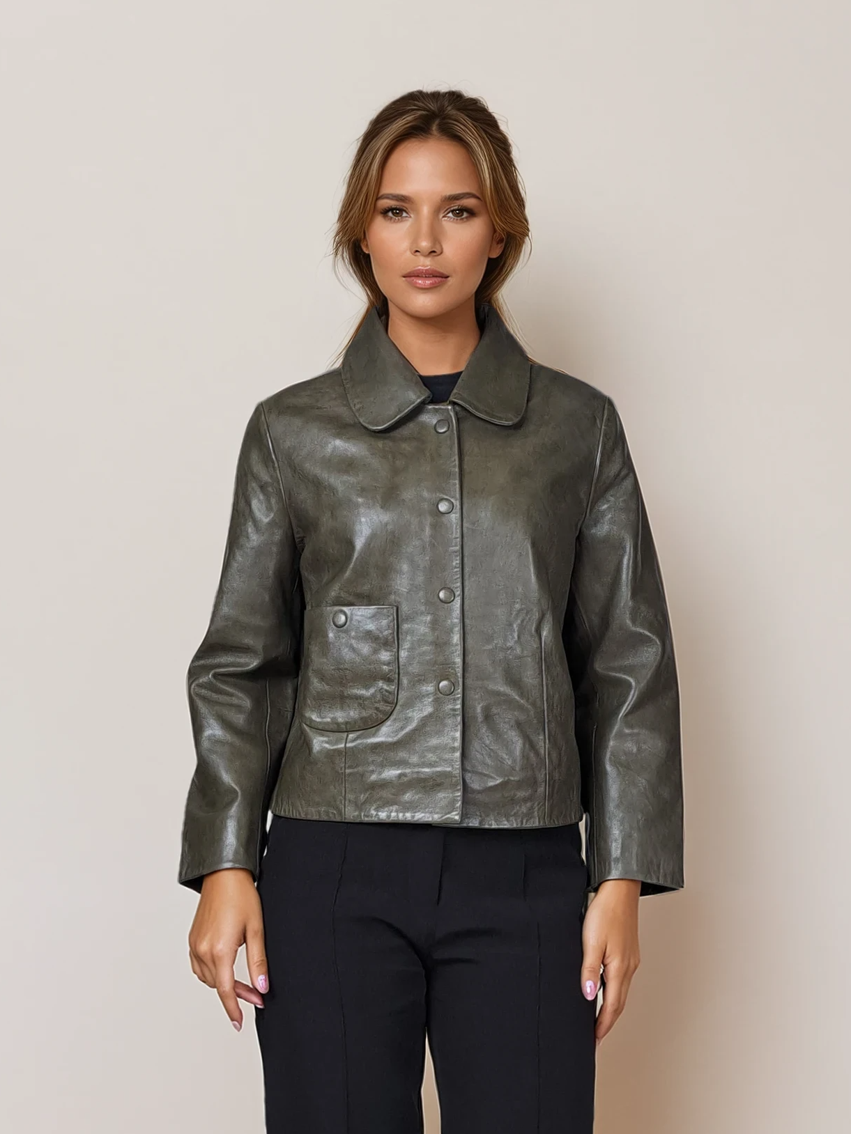 Marley captures contemporary elegance through its precisely cropped 53 cm cut and luxurious lamb leather collar. The smart proportions create a flattering silhouette that transitions seamlessly from office to evening, while the rich olive green leather ages beautifully with each wear. Crafted for the woman who appreciates understated luxury, this jacket pairs with everything from tailored trousers to weekend denim. A timeless investment piece that embodies refined taste and enduring style.