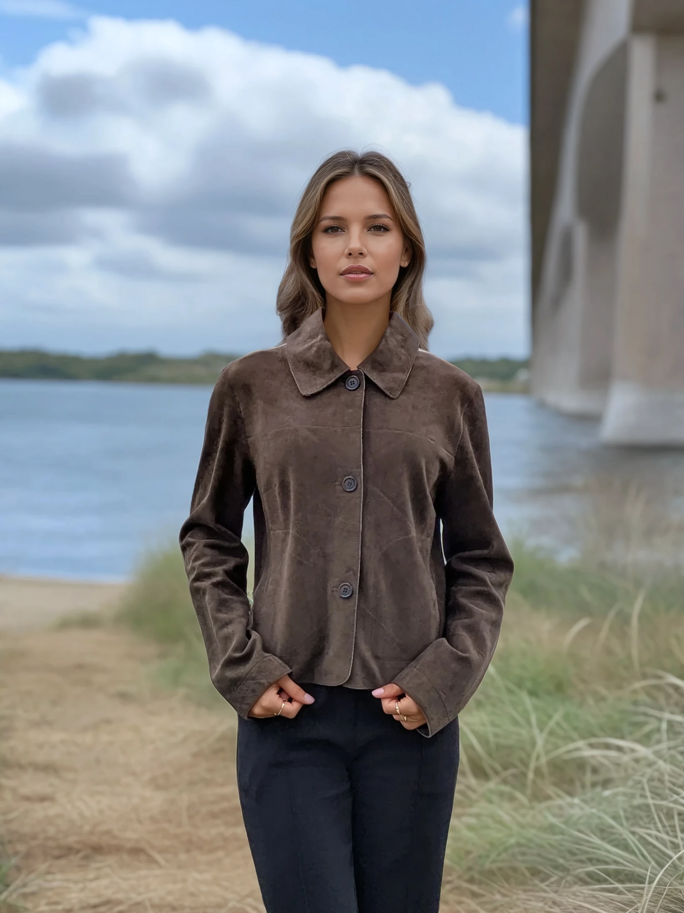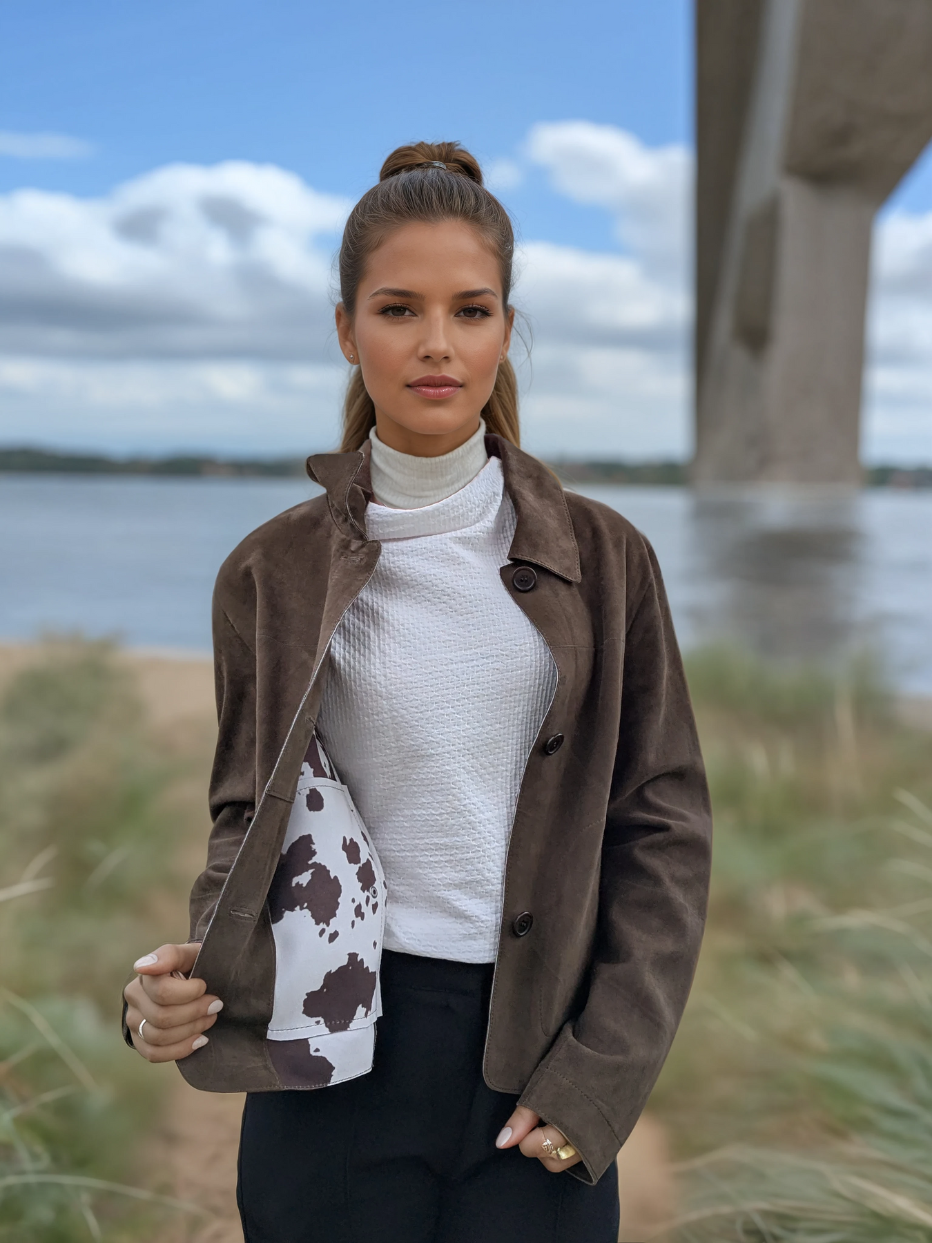 Oplev tidløs elegance med Vida gederusskindsjakke i oliven. Denne damejakke er lavet af Levinsky og har blødt, slidstærkt gede-ruskind for en luksuriøs følelse og en unik ko-printet bundet foring, der tilføjer en stilfuld overraskelse indeni. Perfekt til at løfte din garderobe med en blanding af komfort og karakteristisk design.