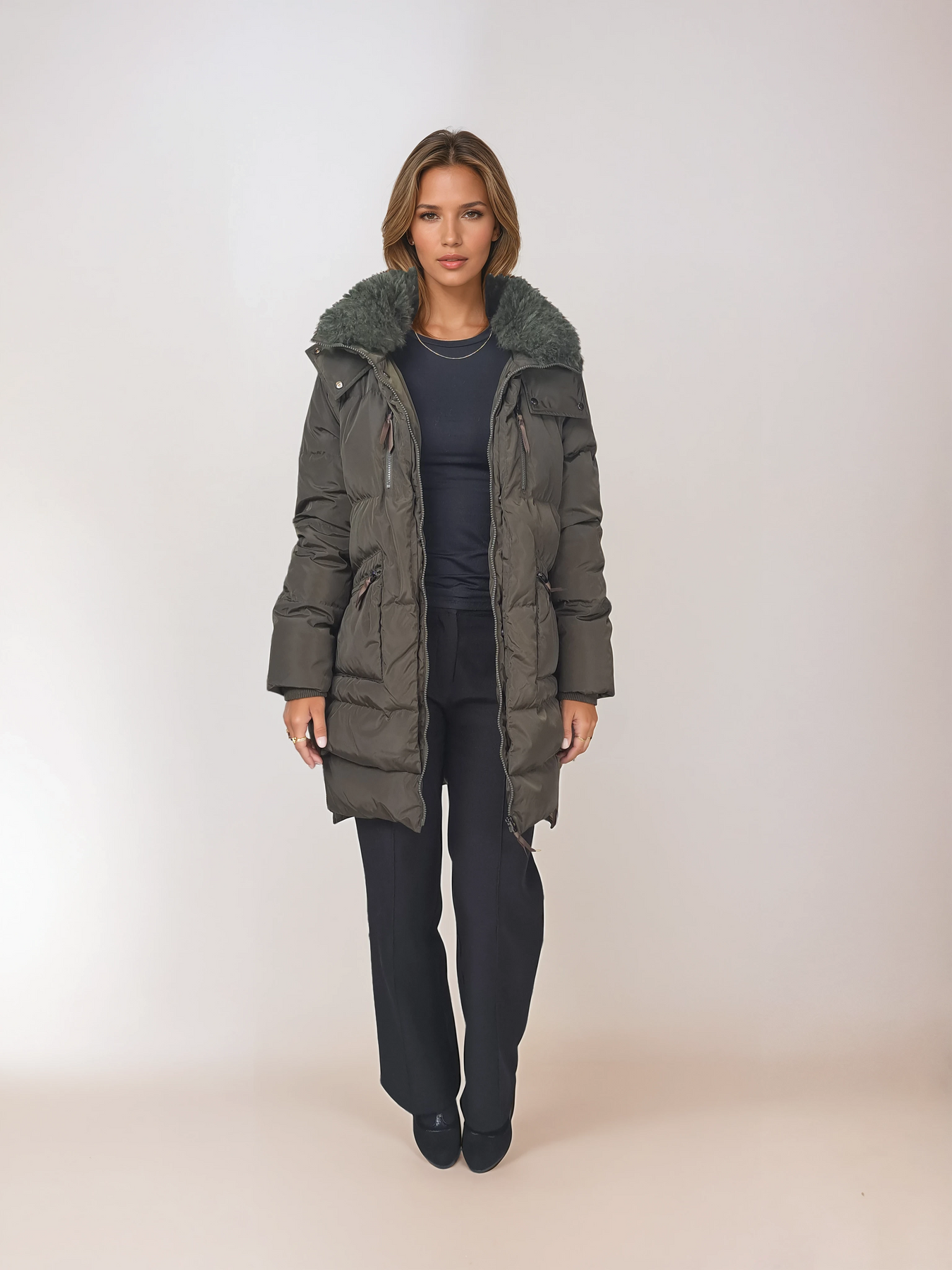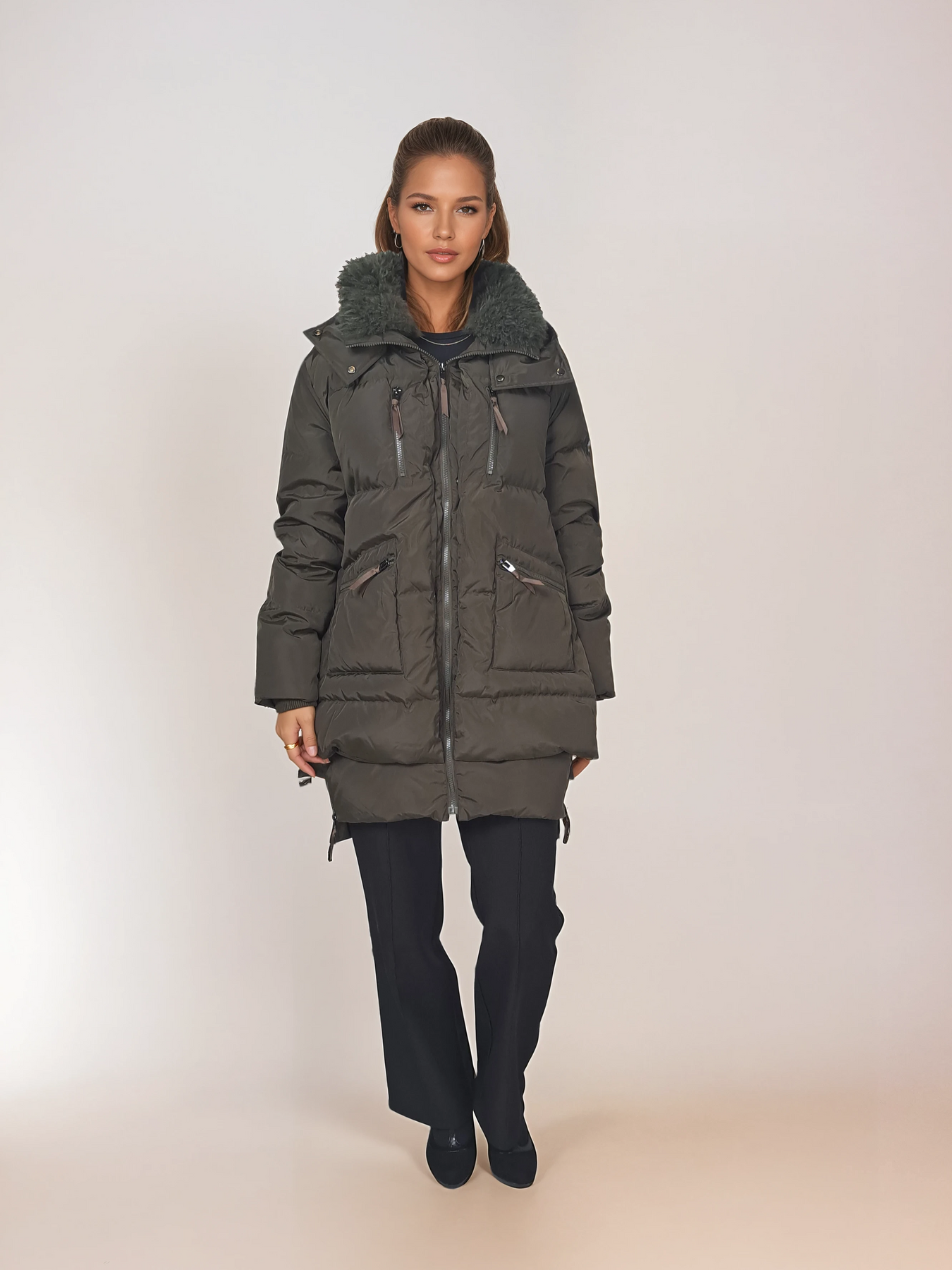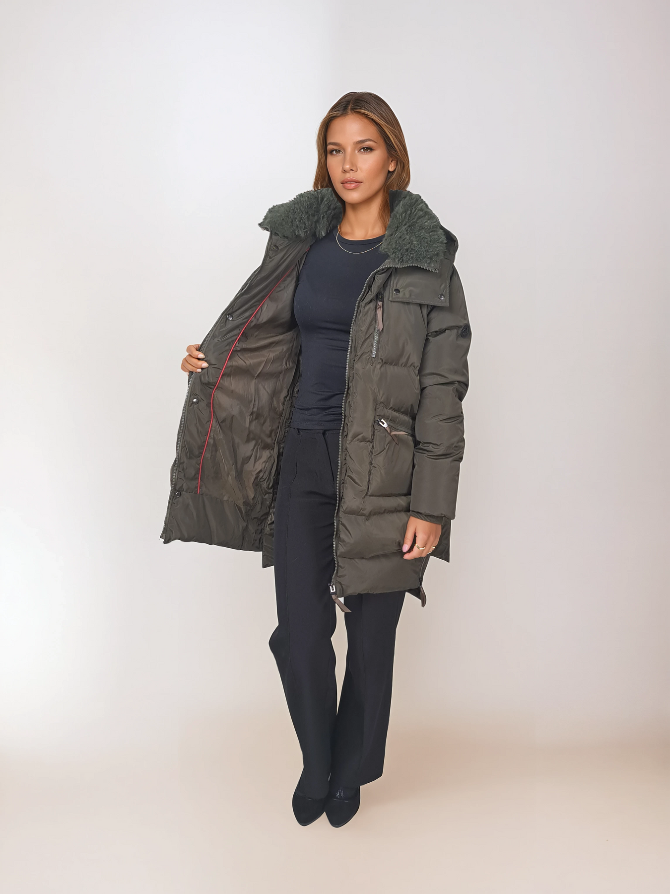 Denne 90 cm army dunjakke fra Levinsky er designet til kvinder og har en lammeuldskrave. Hold dig varm og stilfuld med dets højkvalitetsmaterialer og gennemtænkte design. Perfekt til koldt vejr, denne jakke er et must-have til enhver vintergarderobe.