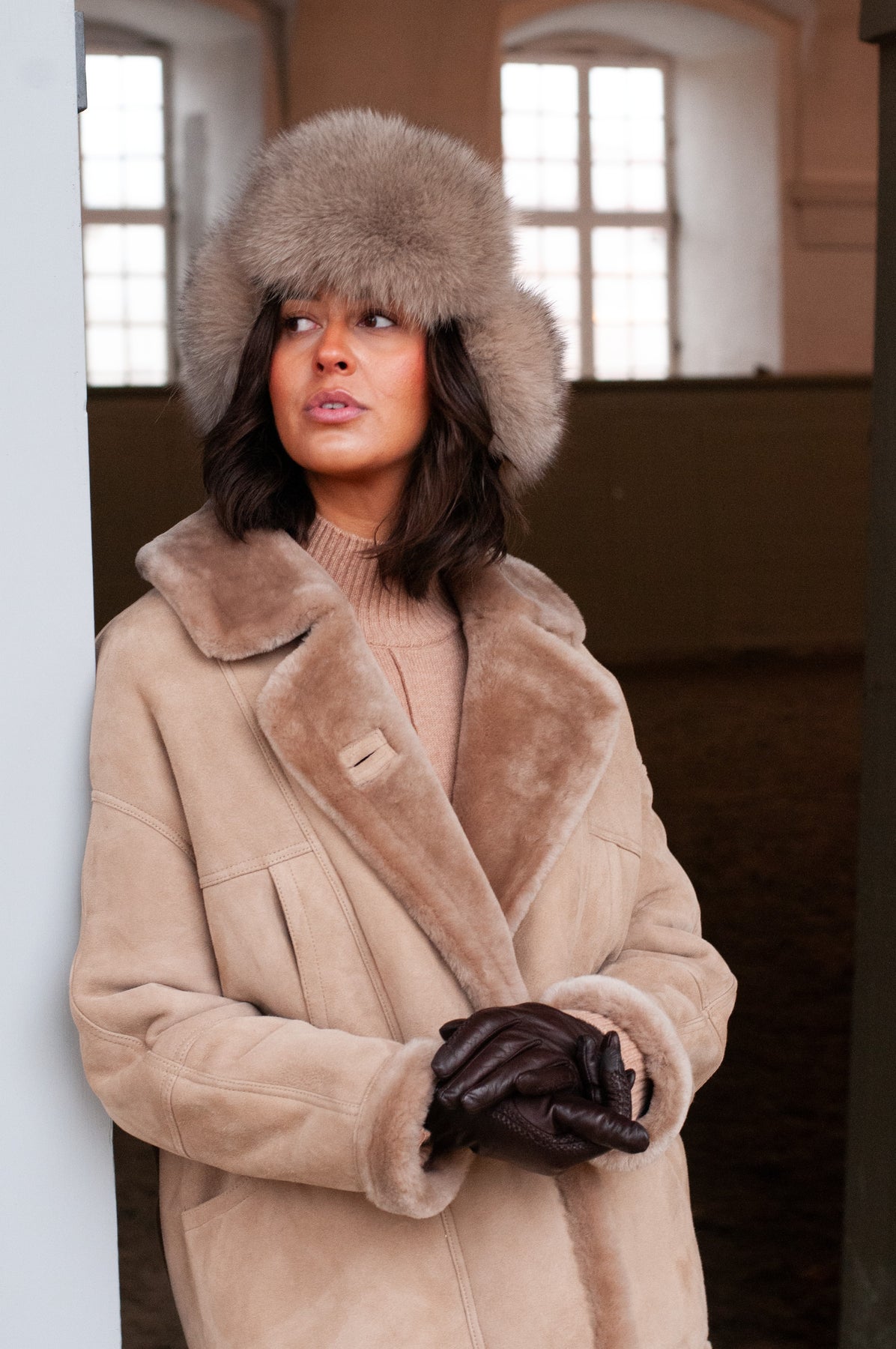 Offrez-vous le luxe avec la veste de shearling Hervati. Fabriqué à partir d'agneau en daim doux, il est chaud et confortable, parfait pour les jours froids. La conception surdimensionnée et les beaux revers lui donnent une sensation chic, tandis que l'option de fermer le col avec un bouton ajoute une polyvalence. Embrassez l'élégance en chêne.
