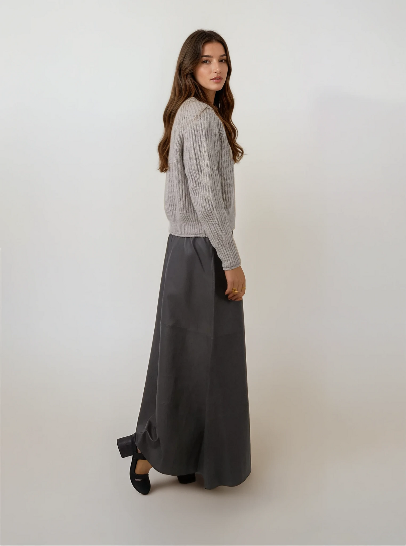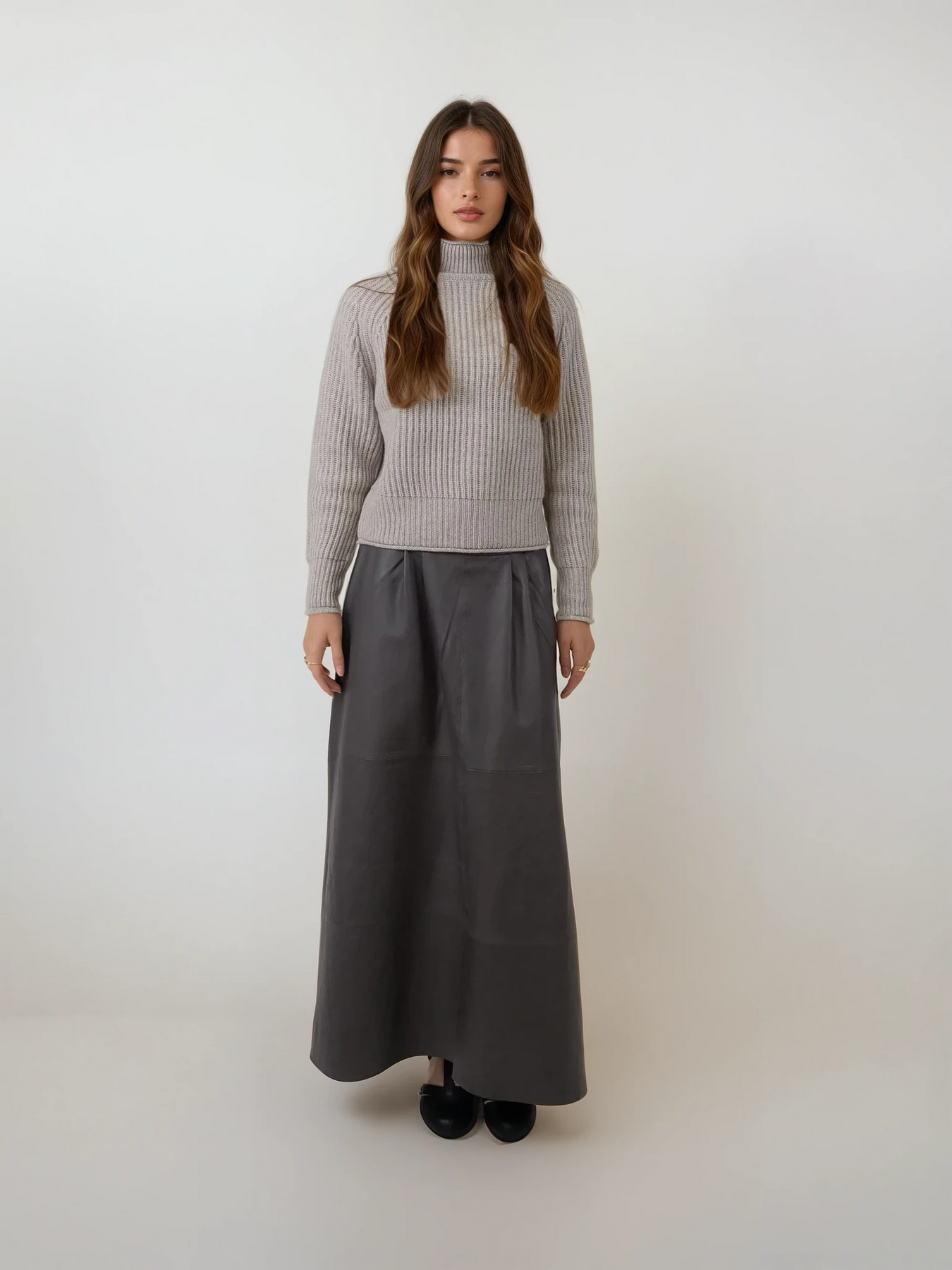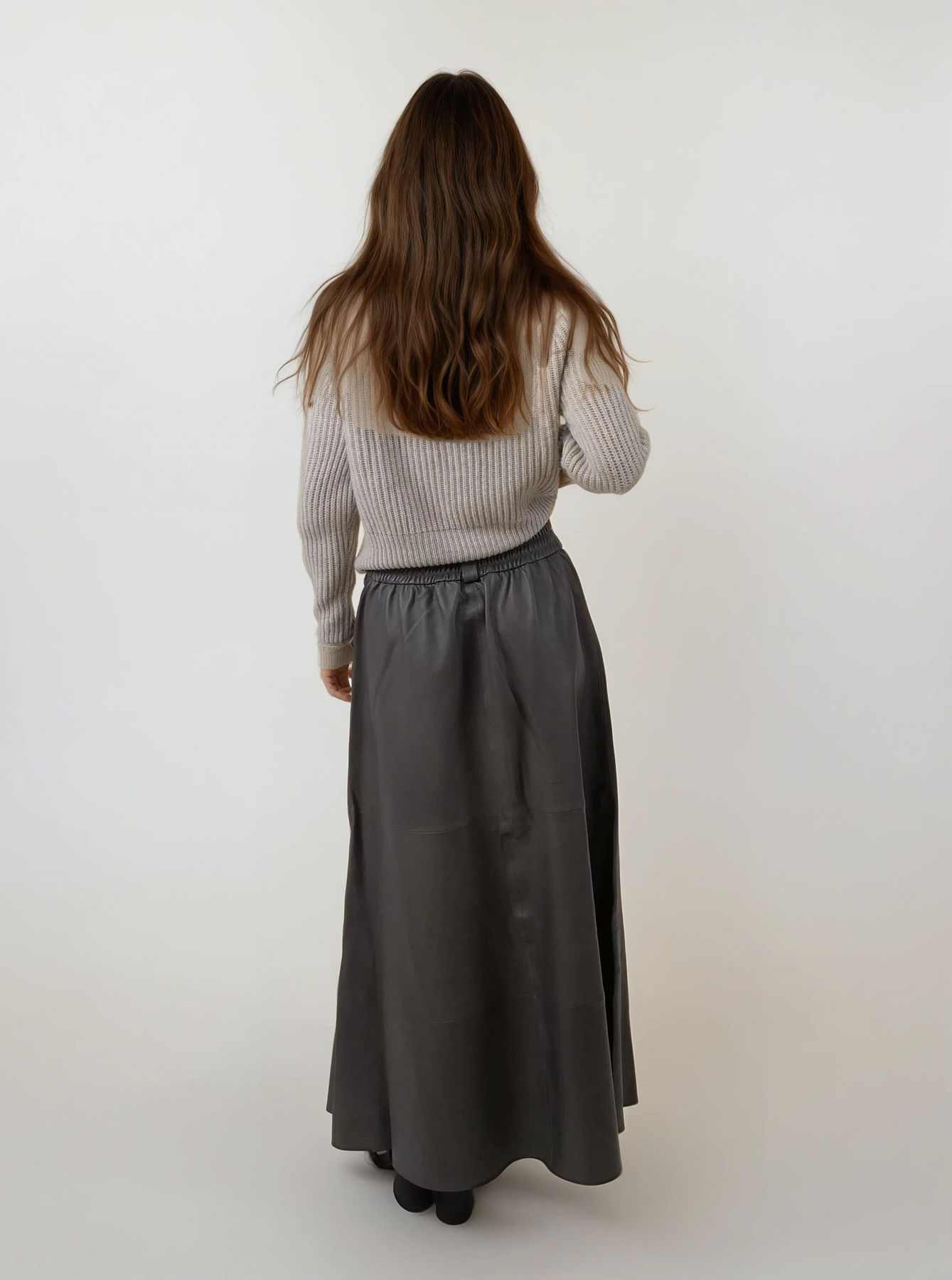 Faites l'expérience du luxe avec notre jupe Theresa réalisée avec 90 cm de cuir nappa d'agneau doux et souple. Cette jupe modèle large, confectionnée par Levinsky, rehaussera n'importe quelle tenue avec sa couleur grise sophistiquée. Adoptez l'élégance et le confort avec la jupe Theresa.