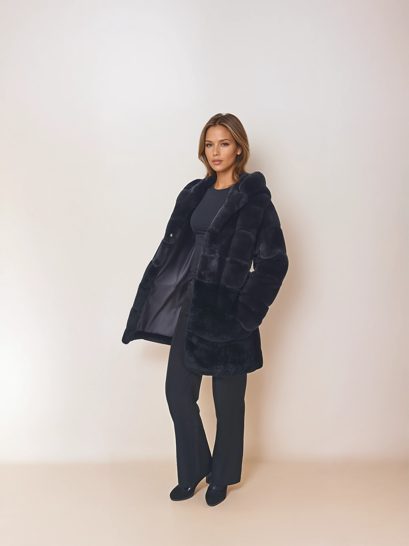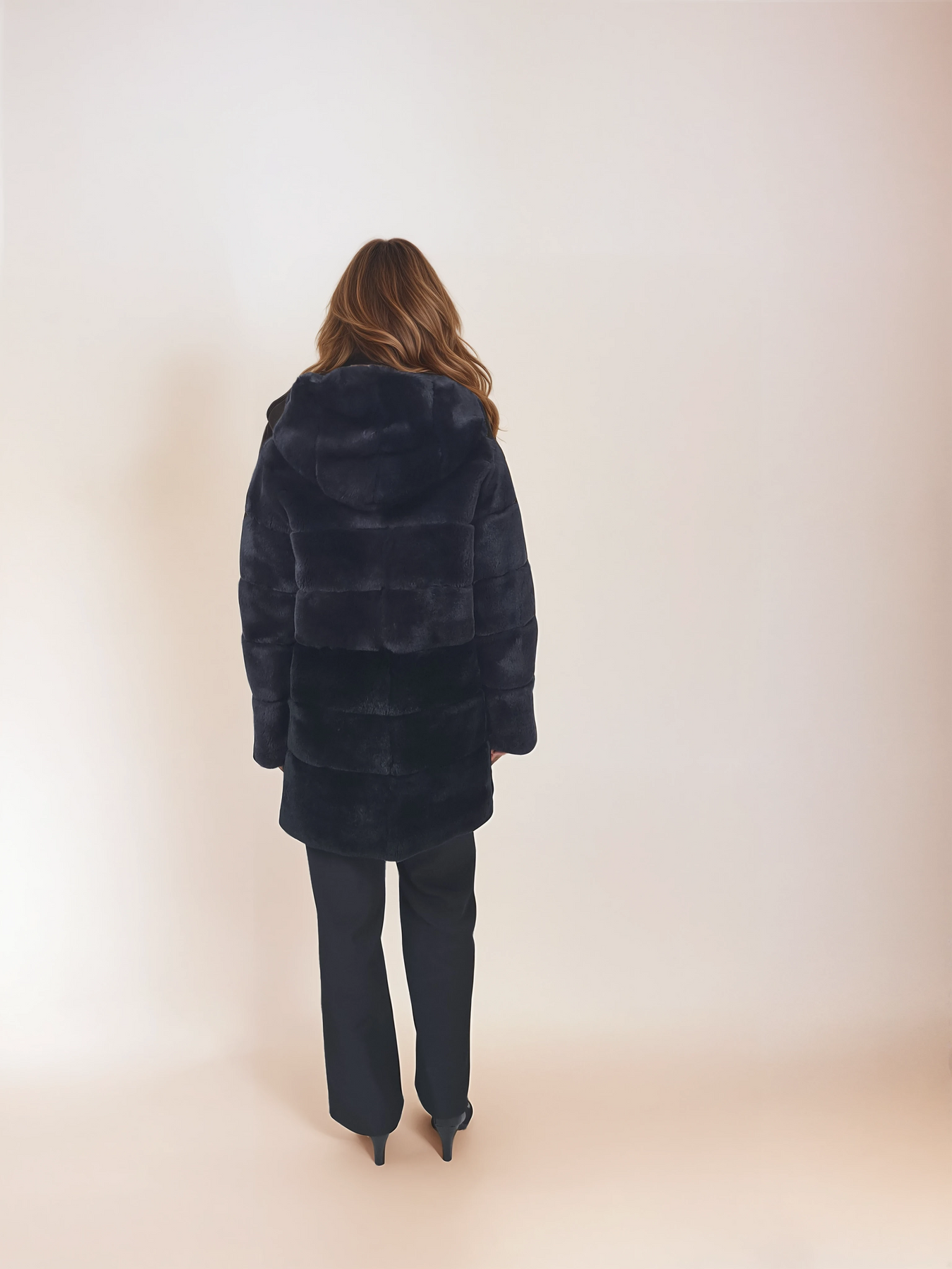 Imelda-jakken eksemplificerer underspillet luksus med dens tofarvede Rex-kaninkonstruktion. Dette 80 cm stykke blander sømløst kul og sort i en sofistikeret palet, der udstråler tidløs elegance. Det overdådige Rex-kaninmateriale giver enestående blødhed og en raffineret æstetik, mens den tofarvede sammensætning tilføjer subtil visuel dybde. Perfekt til kvinden, der søger investeringsstykker, der overskrider sæsoner, denne jakke leverer kompromisløs komfort og poleret stil til enhver lejlighed.