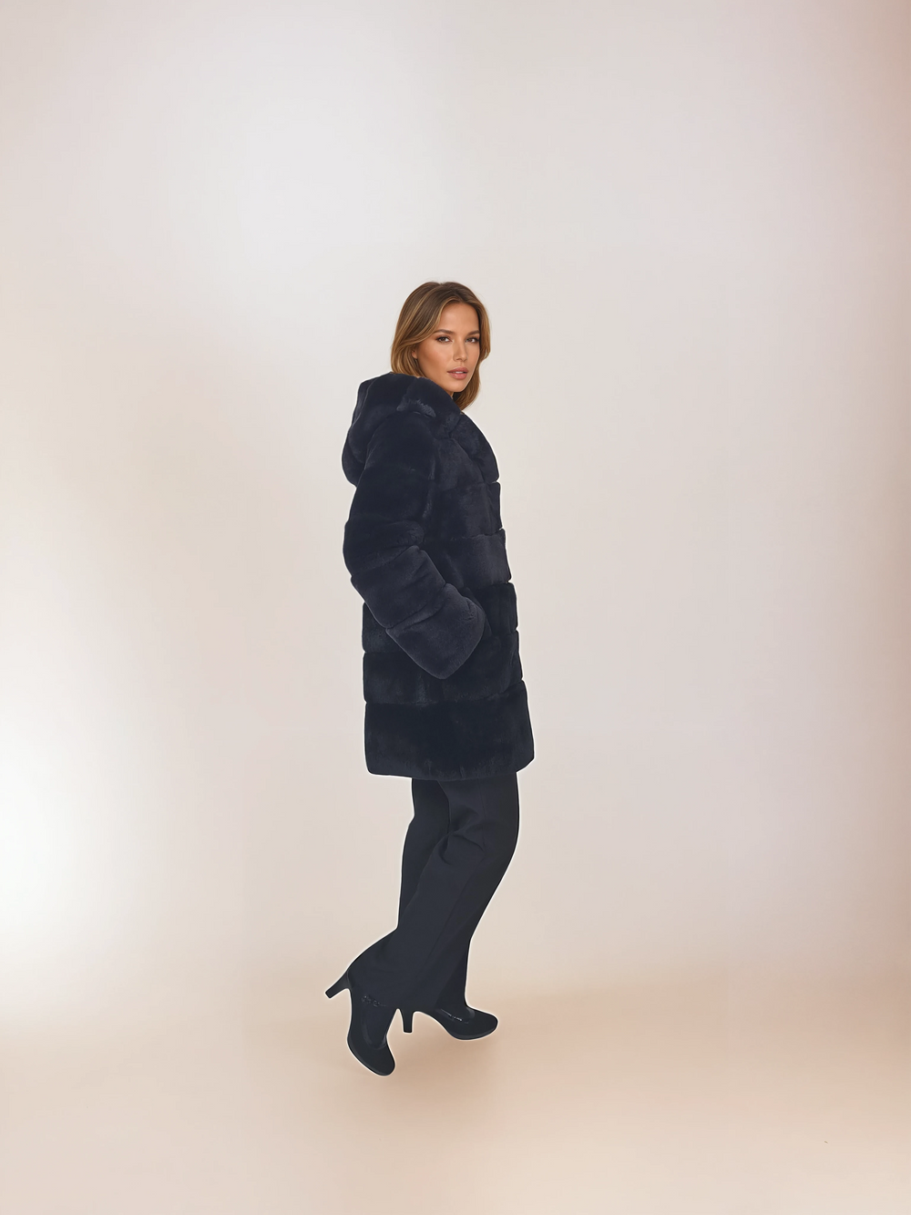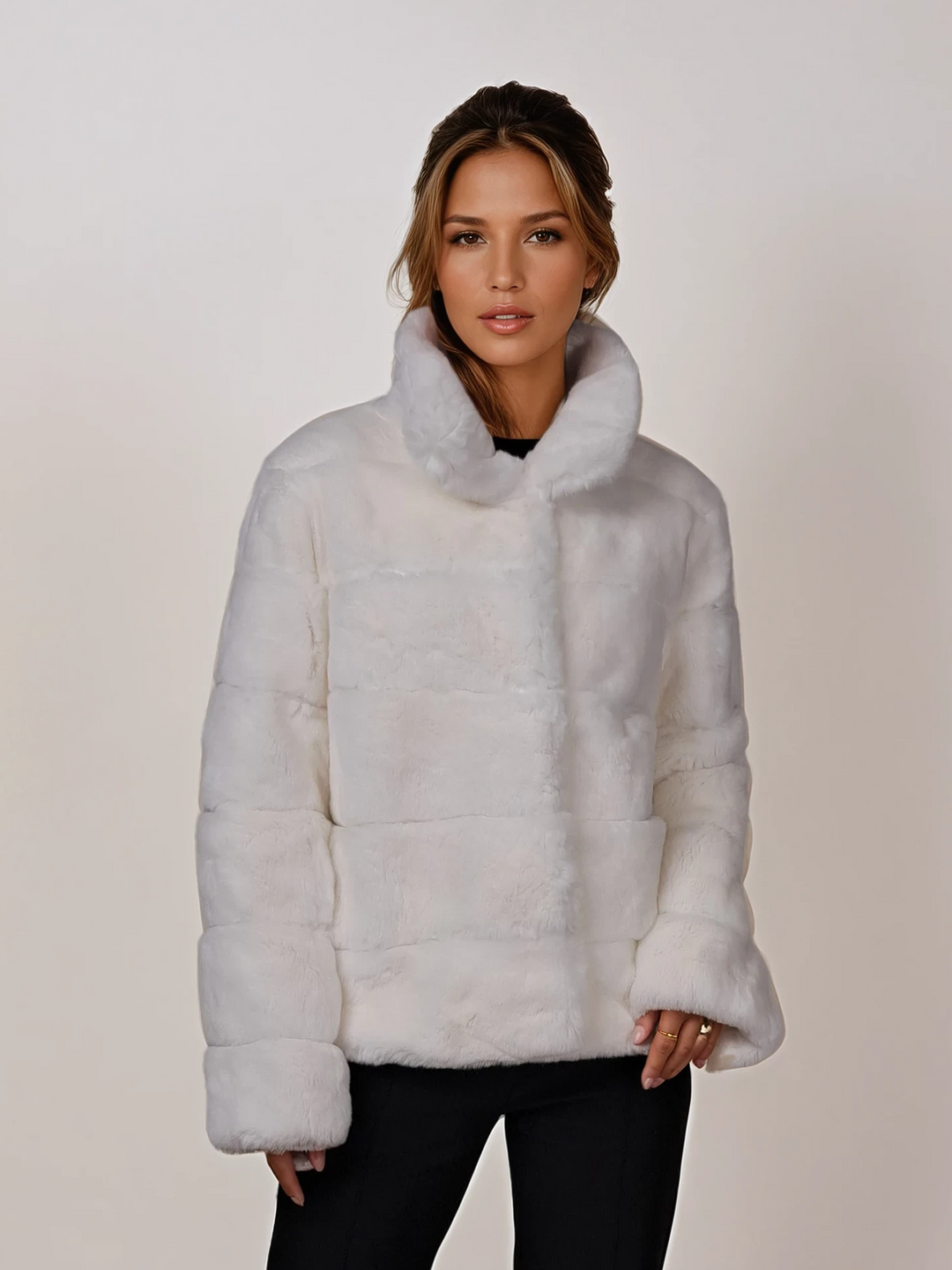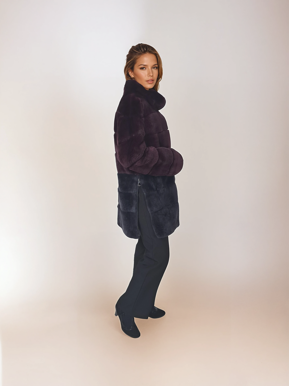 Upplifðu flauel -mýkt kanínu (REX) skinnsjakka. Kanínaskinn er þekktur fyrir plush áferð sína og bætir við lúxus við söfnunina okkar og tryggir bæði stíl og þægindi.