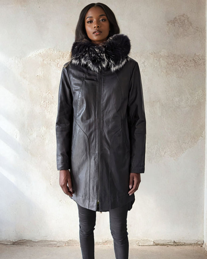 Leðurjakka með skinnhettu