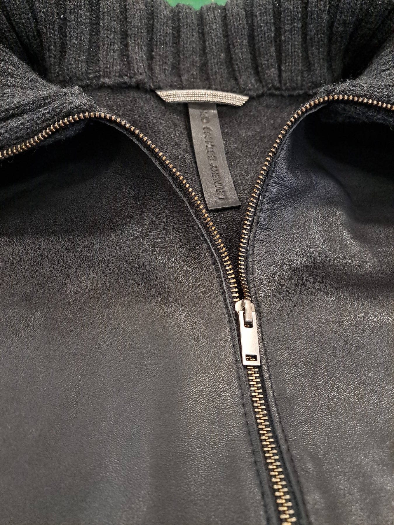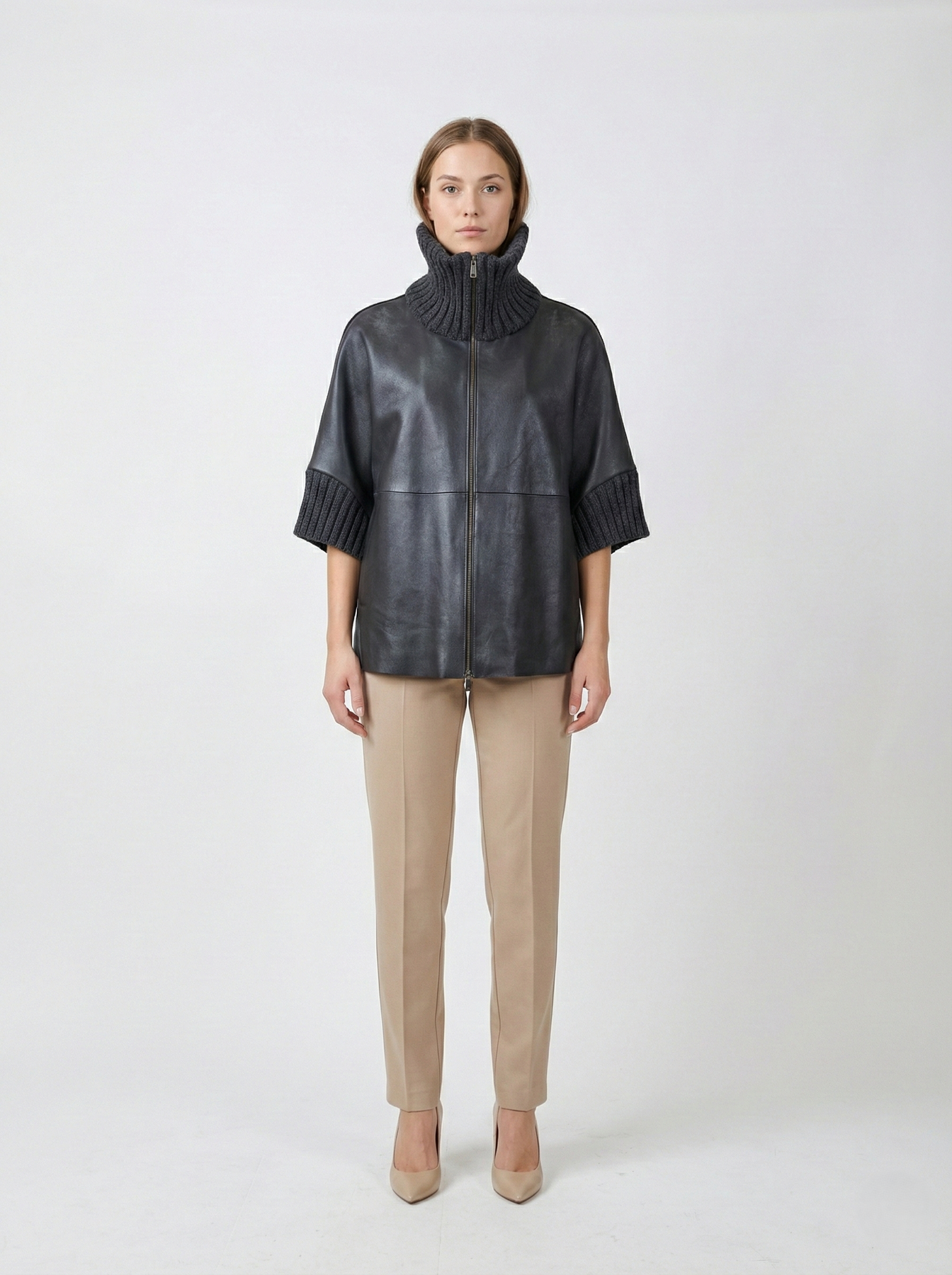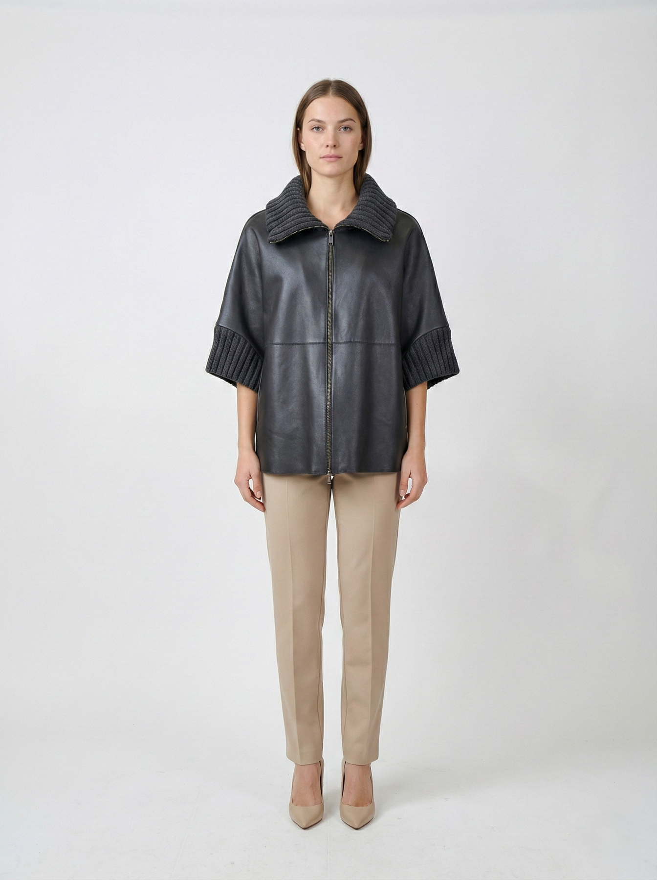 Dramatic cape silhouette in supple lamb leather with a knit back for fluid movement and comfort. Ribbed collar and cuffs anchor the design with refined detail. The relaxed cape cut accommodates most sizes, offering effortless elegance without compromise. Lined in soft lamb leather for a luxurious feel against the skin. A Levinsky creation that transforms any outfit into something extraordinary.