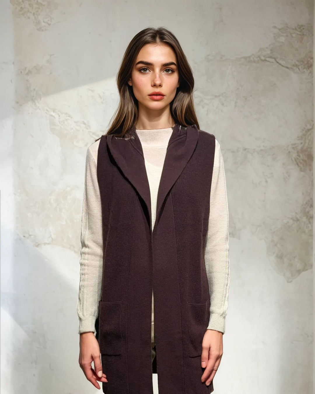 Pak dig ind i luksus med vores 100 % ren kashmir lange vest i en rig brun nuance. Denne vest er strikket for varme og komfort og har en hyggelig hætte. Løft din stil og hold dig varm denne sæson!