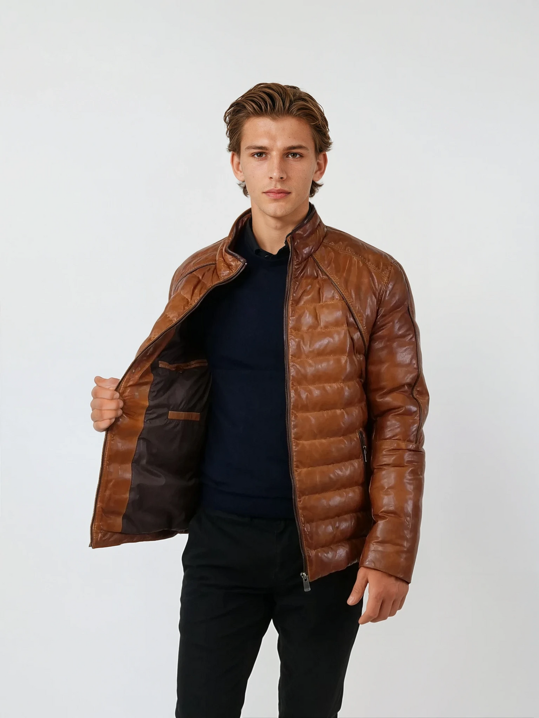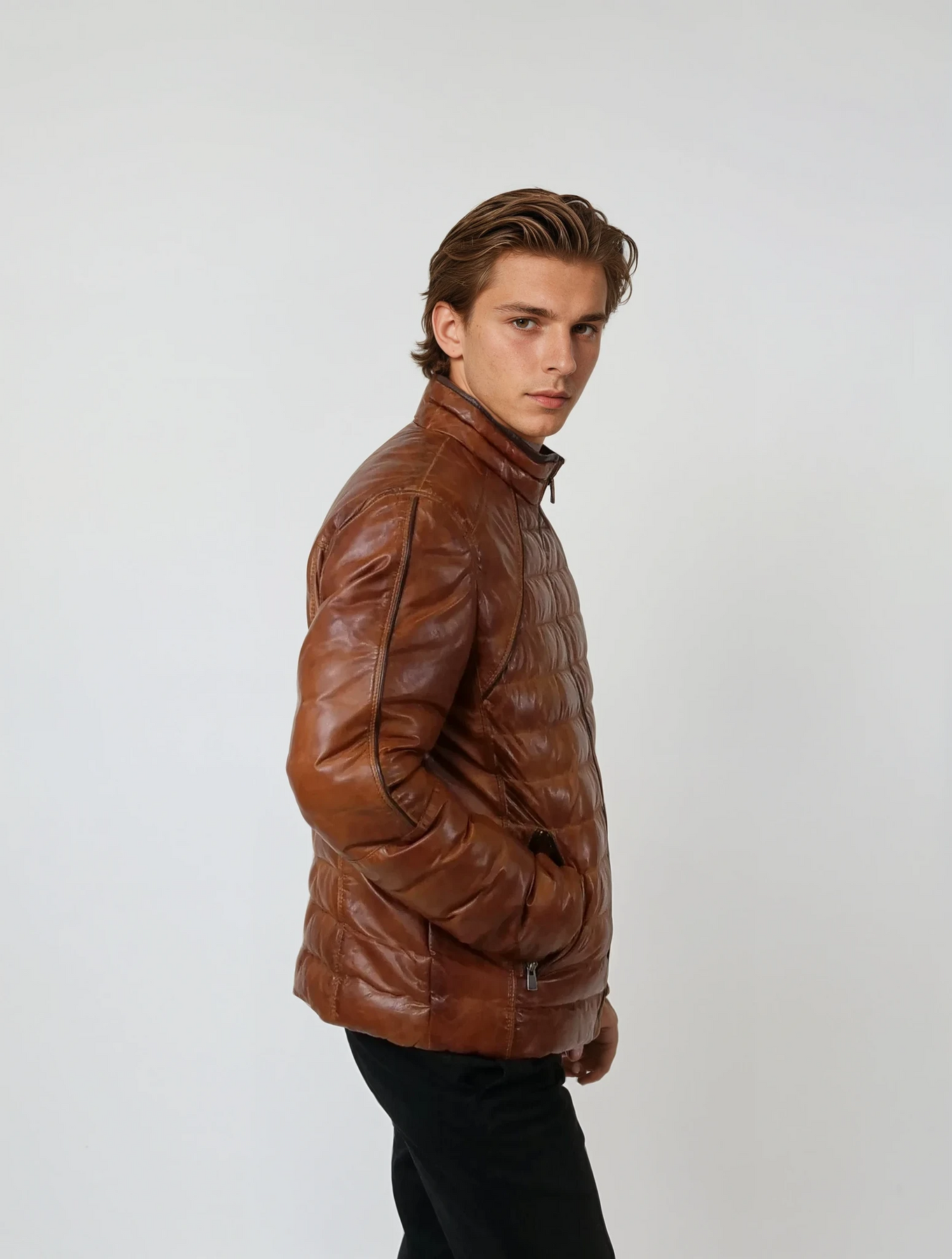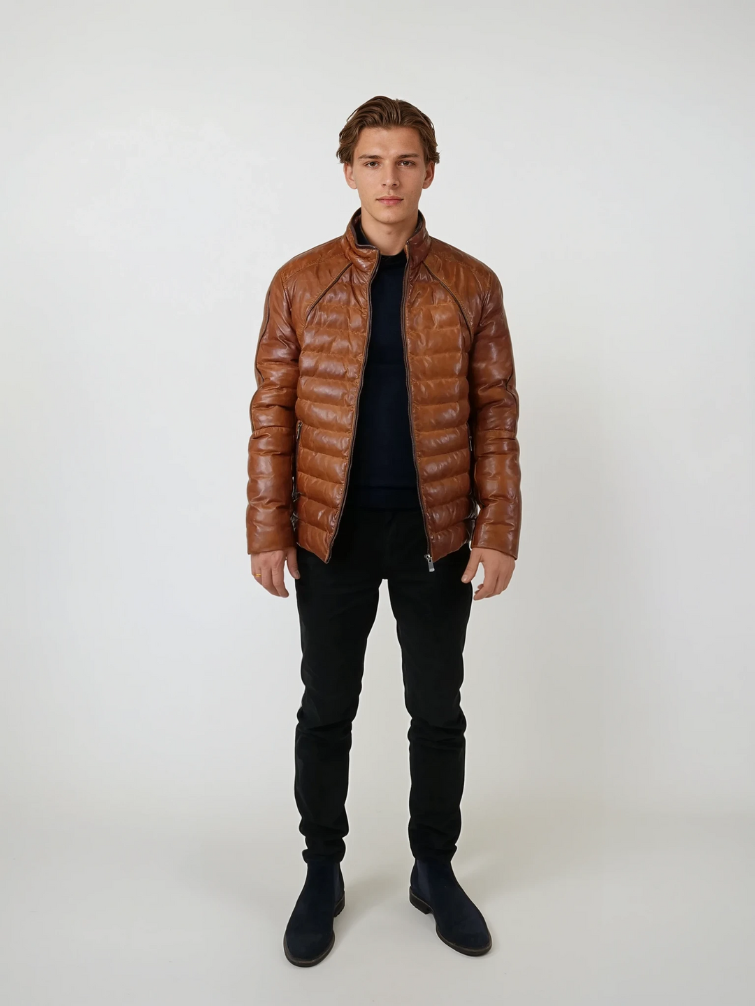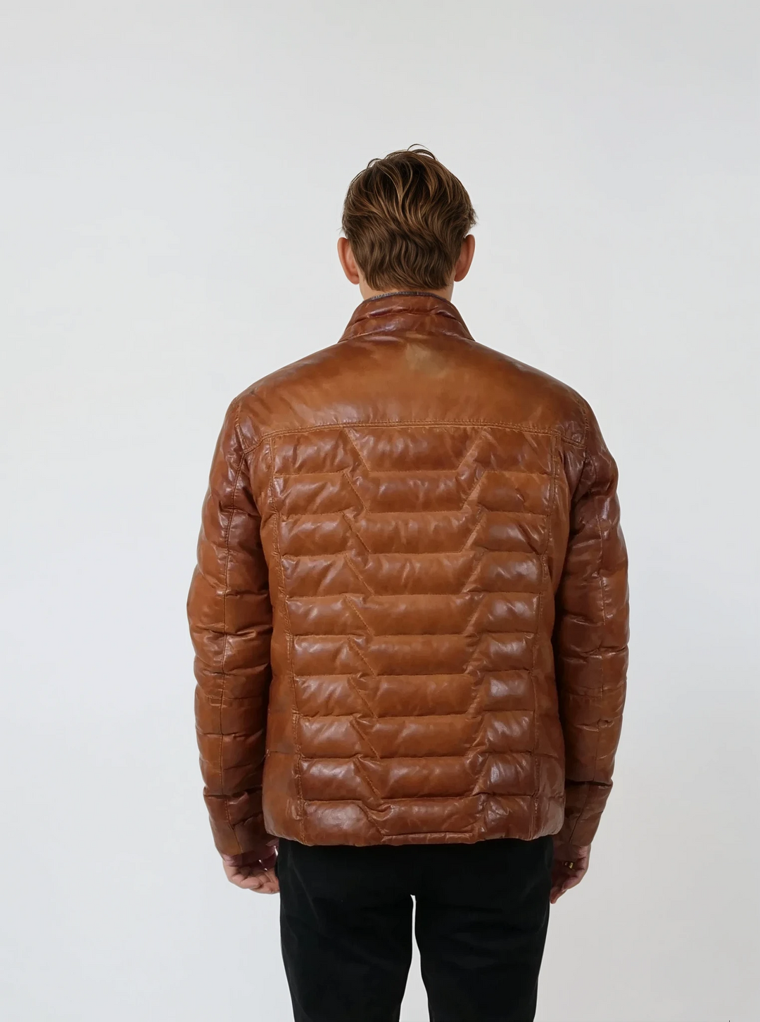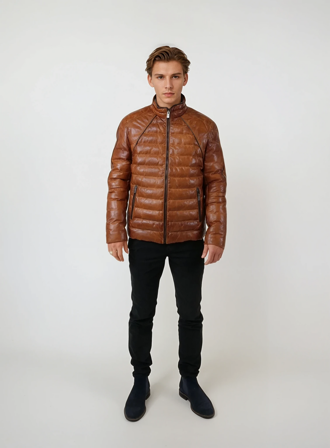 Kombinér det rå udtryk fra en klassisk skindjakke med den enestående komfort fra en let varmt foret jakke. Jakken er fremstillet af det blødeste, handskebløde lammeskind i en dyb cognac-farve og er foret med isolerende dun, der holder dig varm uden at tynge. De horisontale syninger skaber et moderne puffer-look, mens de markerede detaljer ved skuldrene tilføjer et raffineret og maskulint touch. En perfekt jakke, der ubesværet forener luksus med funktionalitet.