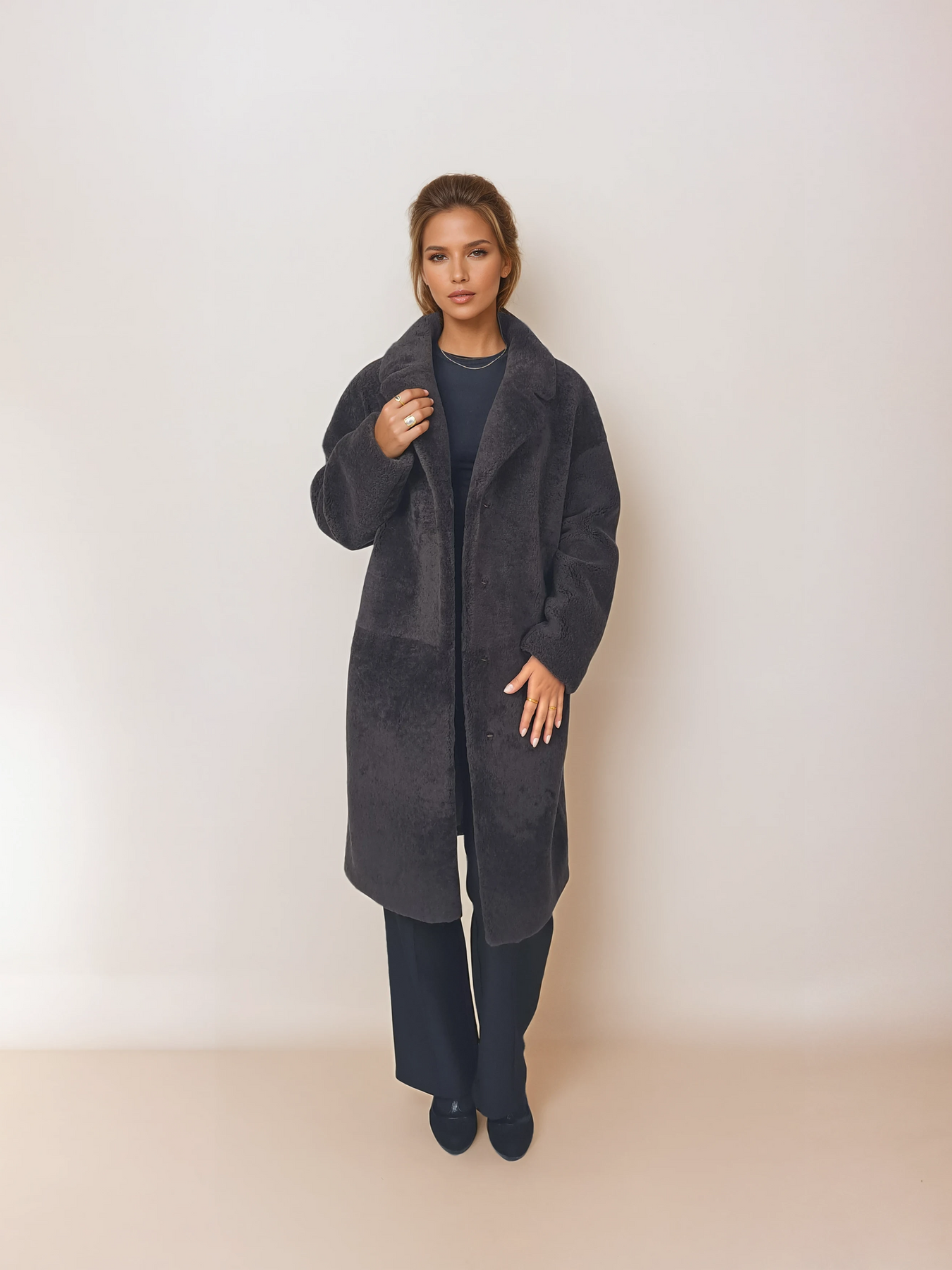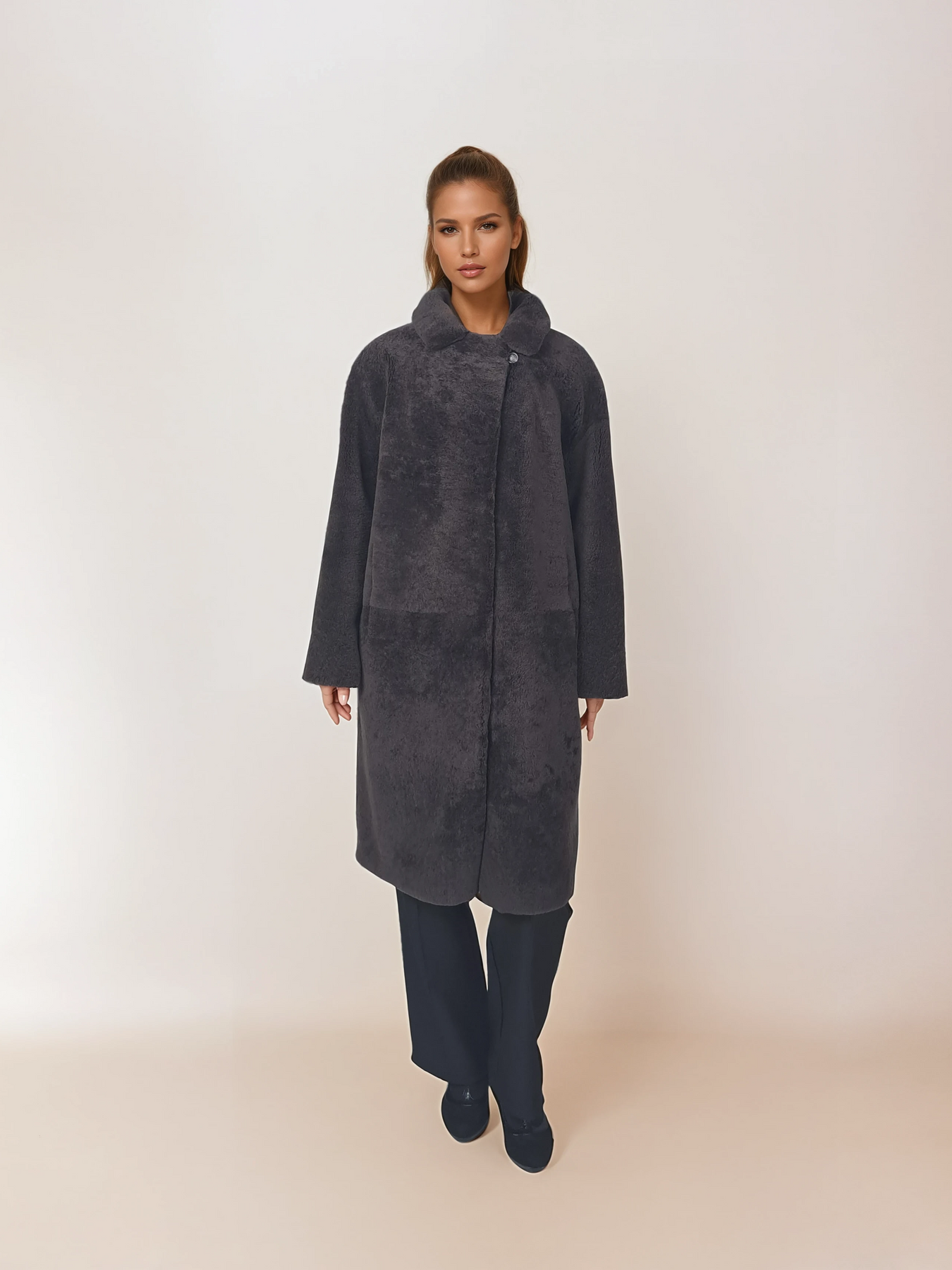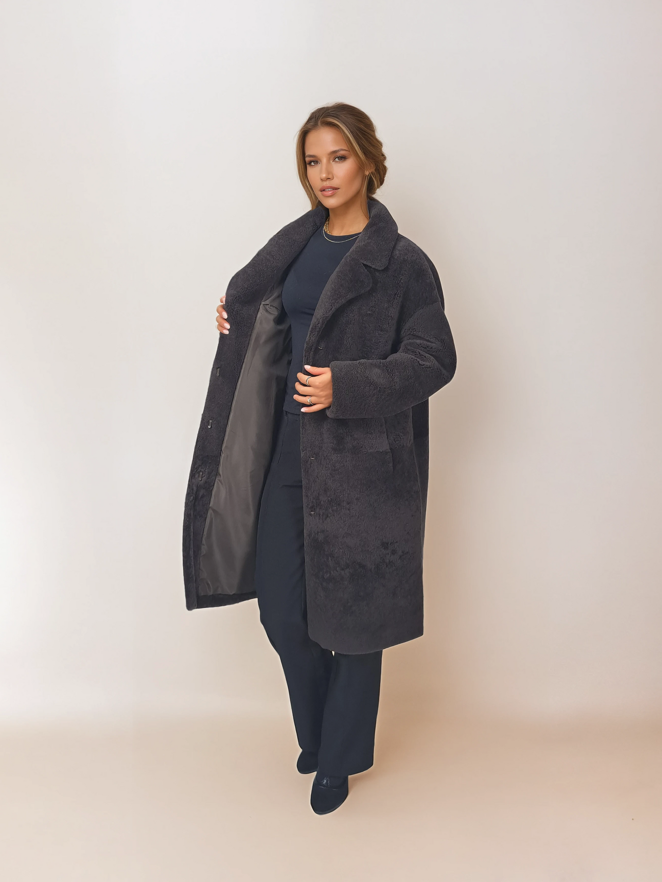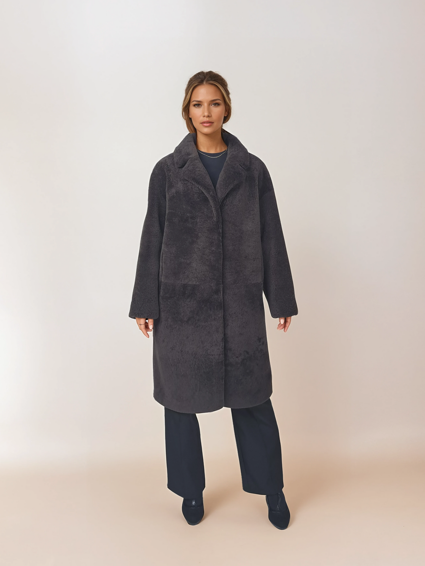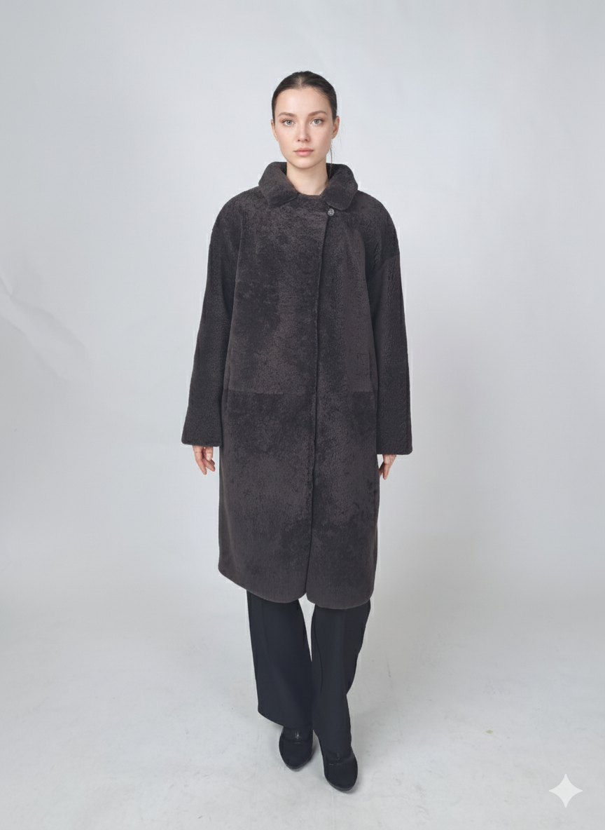 Denna sofistikerade lockiga lammkappa för kvinnor visar upp en lyxig textur i en varm kaffeton, komplett med en elegant krage som spänner över 95 cm. Den distinkta böjda luggen skapar visuellt intresse och taktil rikedom, medan den raffinerade silhuetten säkerställer enkel sofistikering. En investeringspjäs som kombinerar exceptionell värme med uthållig stil för den kräsna kvinnan.