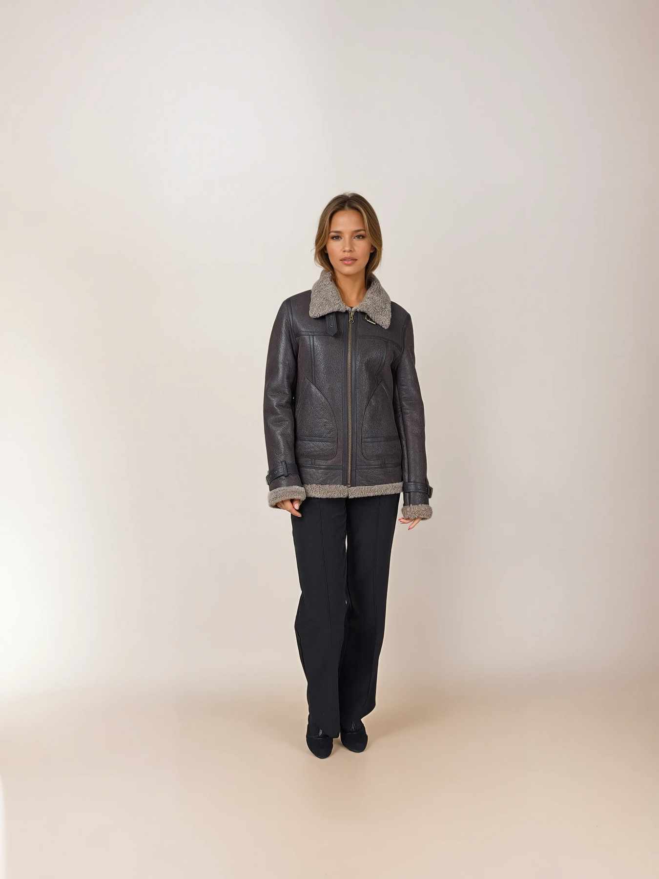 A classic shearling bomber jacket for women is a stylish piece of outerwear that combines the timeless bomber jacket design with the luxurious warmth and softness of shearling fur. This jacket features a relaxed fit with lamb fur cuffs and hem, providing a snug fit around the waist and wrists. It has a front zipper closure and a shearling fur collar for extra warmth and elegance.